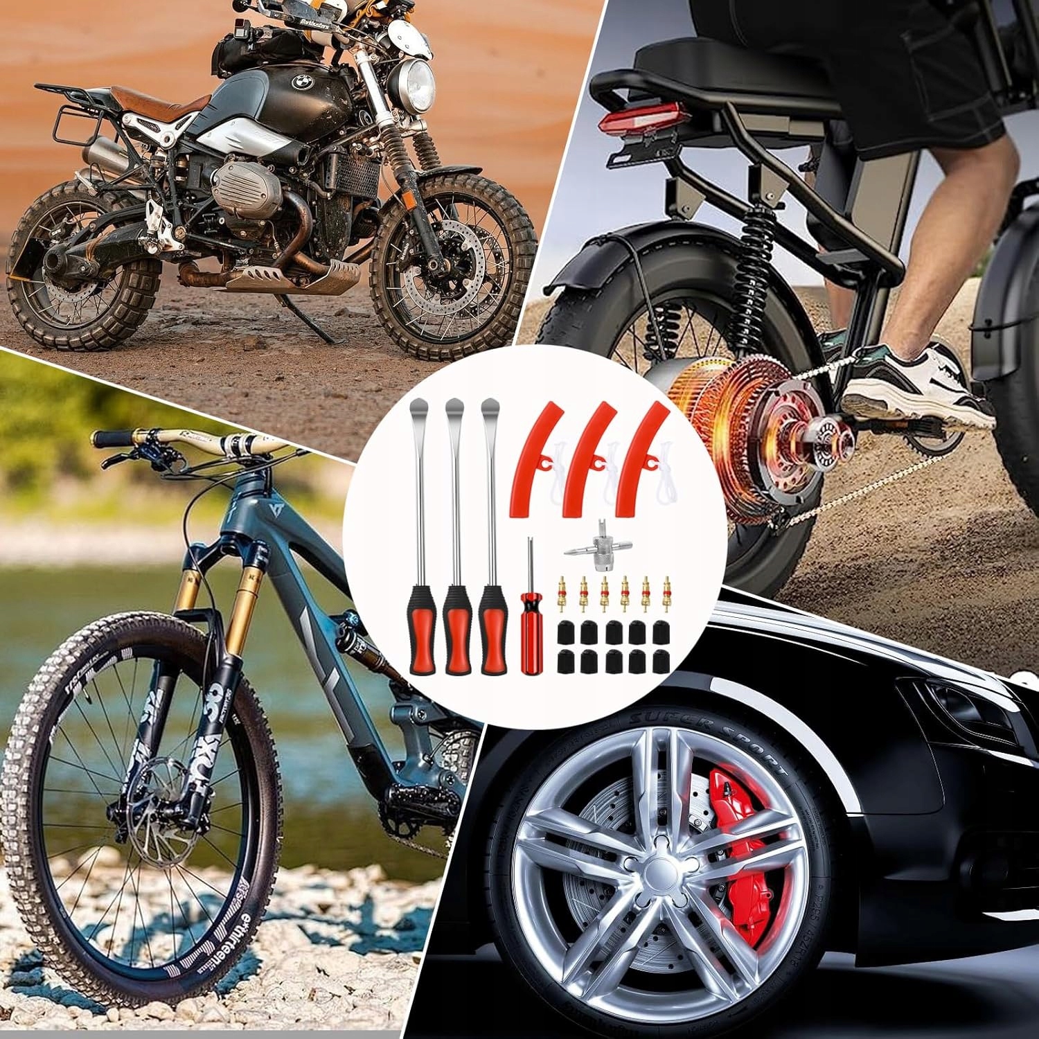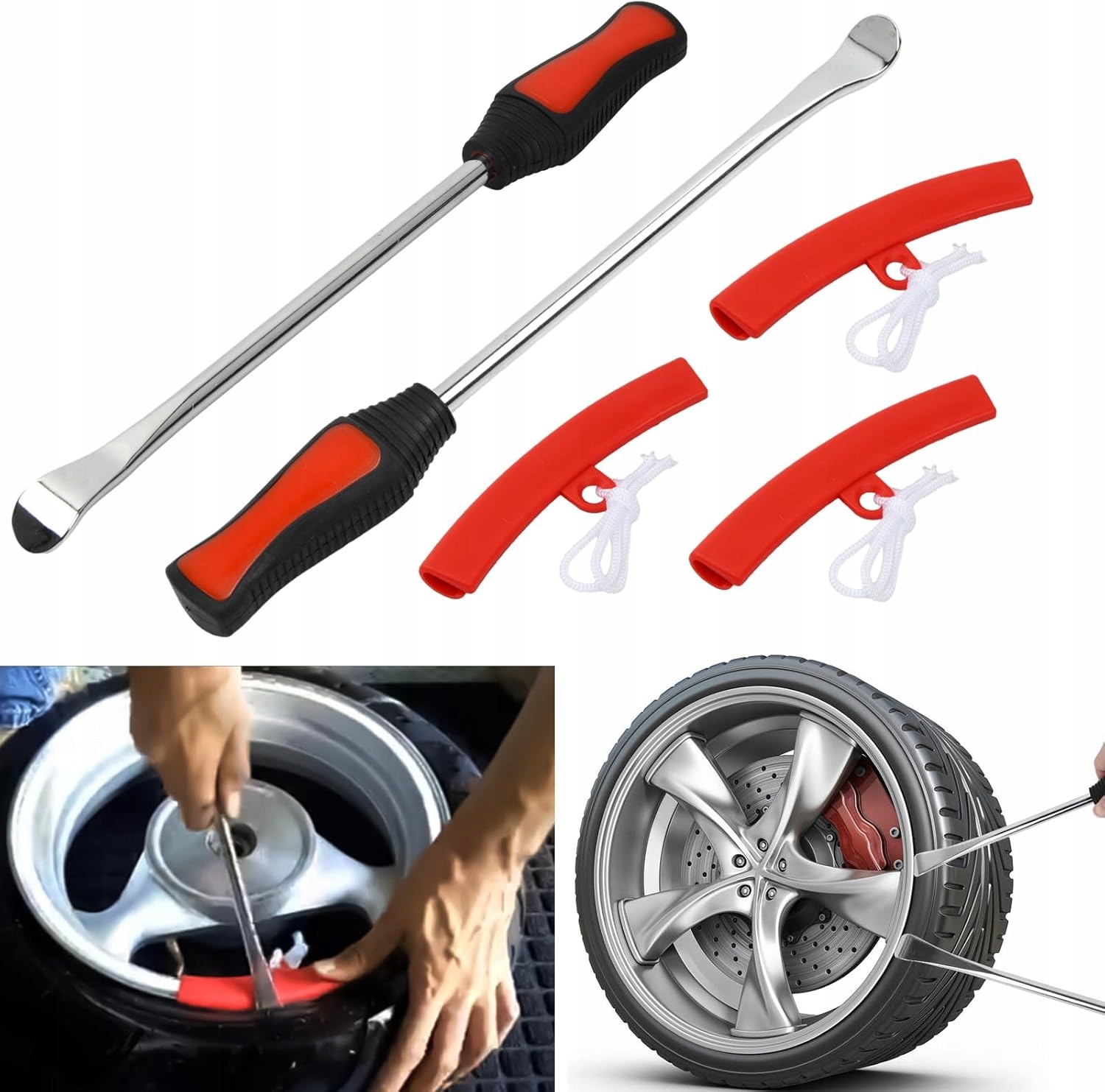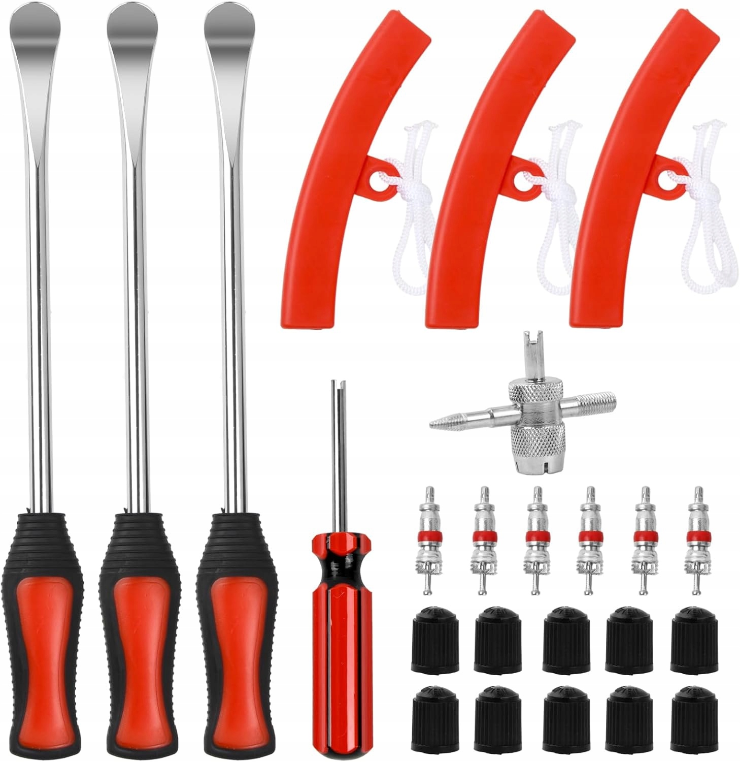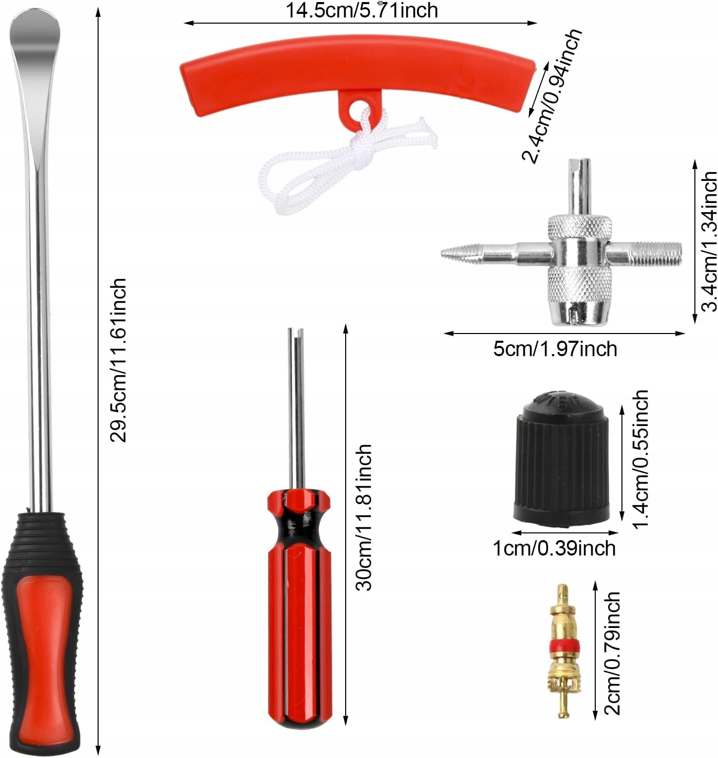 содержит 3 лезвия шин (красные и черные), 3 защитные ободки, 1 кросс -ключ, 6 серебряных клапанов и 10 колпачков для клапанов. Общая длина инструмента монтажа шины составляет около 295 мм (11,5 дюйма). Это обеспечивает лучший рычаг и облегчает замену шин