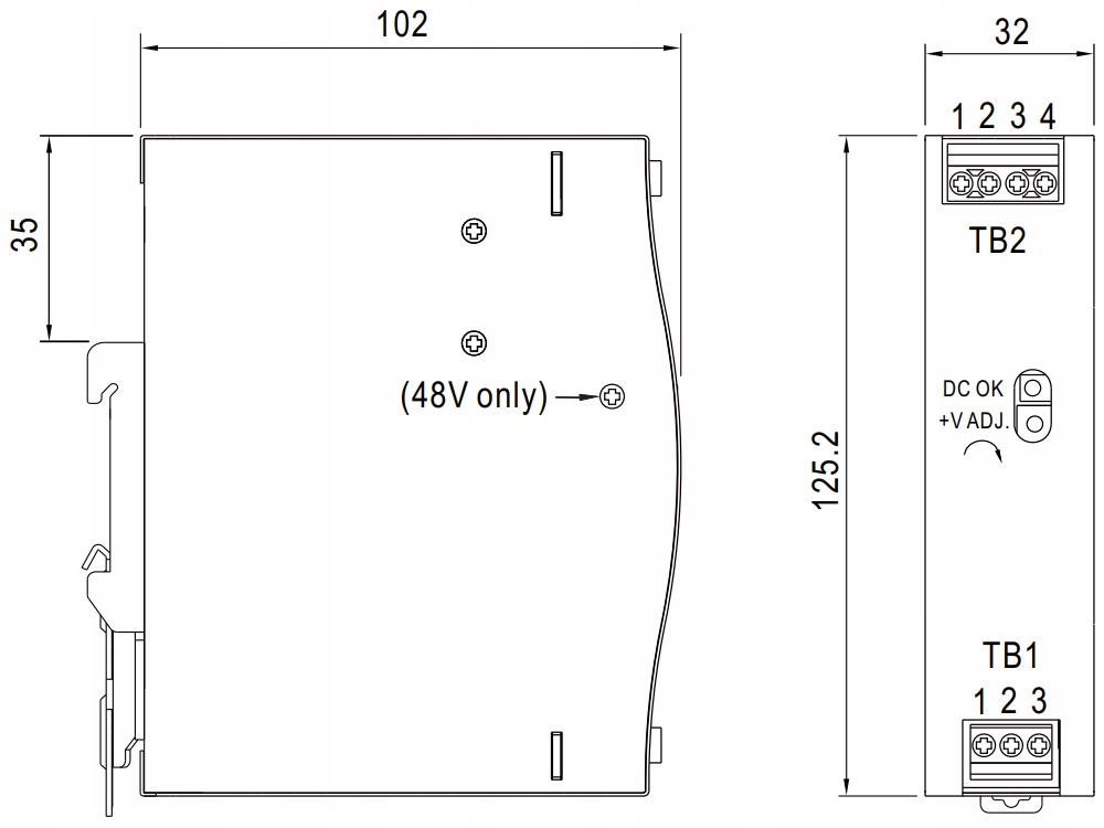 Импульсный источник питания, установленного на рельсе TS35/7,5 или 15 DIN, устойчиво к высоким рабочим температурам (до 70 ° C)