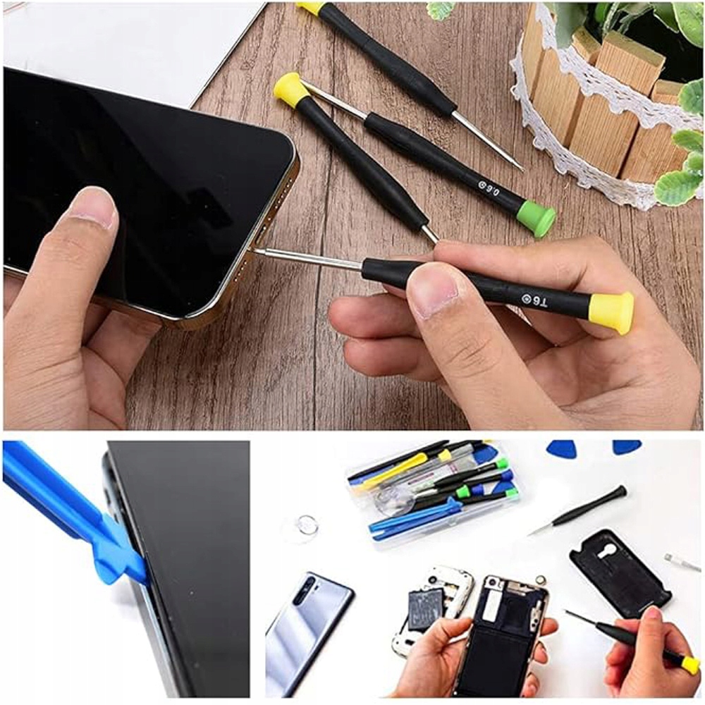 - Набор ремонтных инструментов 24 в 1 из самых жестких пластиков для демонтажа и ремонта мобильных телефонов, прочные и точные инструменты для профессионального ремонта помогают получить большую поддержку в ремонте устройств. Вы можете легко исправить свои устройства самостоятельно, не прося других о помощи. Не -скользящие магнитные отвертки и гибкая всасывающая чашка экран. Он специально разработан в соответствии с эргономическим дизайном, ручкой из силиконового материала, более длинной, удобной и неразличительной. Всасывающая чашка из ПВХ регулируется на многих углах и отключена. Он подходит не только для серии iPhone, но и для ЖК -экранов более крупных планшетов и других подобных устройств. Ручка оснащена безопасным цилиндром, который может предотвратить разрыв деликатных гибких кабелей при открытии