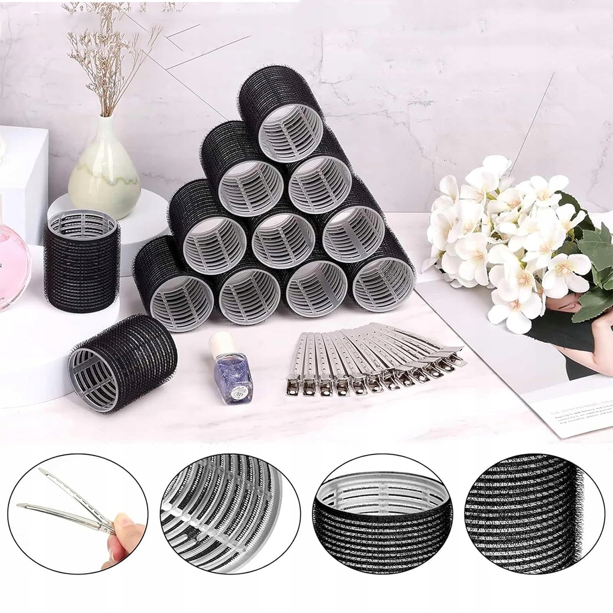 ✔ 【Набор идеальных самостоятельных роликов】 самостоятельные ролики содержат 12 шт. Большие черные ролики с диаметром ок. Запонки для волос в форме утки диаметром 48 мм и 12 штук из нержавеющей стали. Это позволяет создавать завивки любого размера, поднимать их и увеличивать их объем. Его можно использовать для создания волн, ретро -роликов, ударов и других форм волос или наконечников для волос.