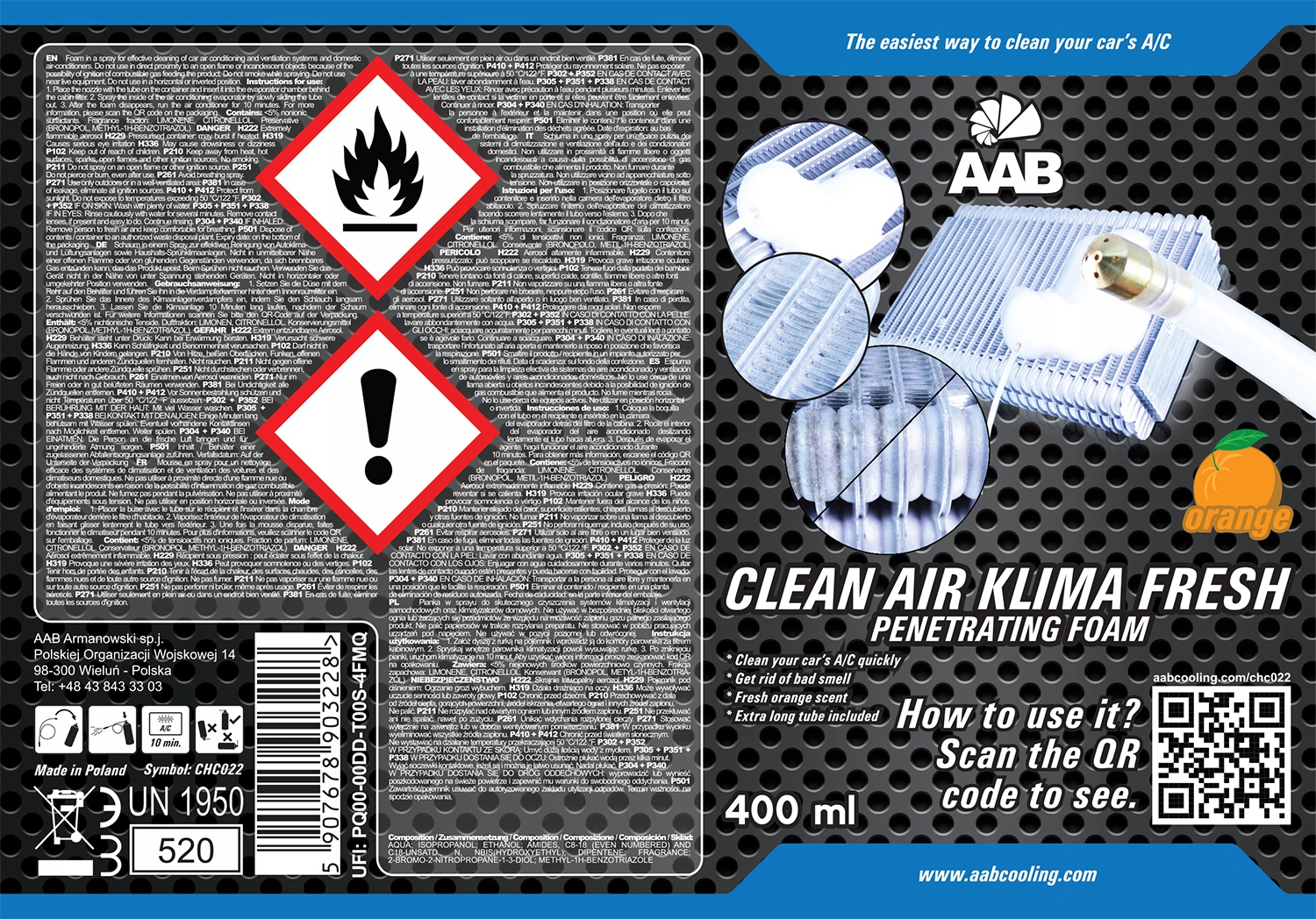 24 x AAB CLEAN AIR KLIMA FRESH PENETRATING FOAM 400 мл (активная пена) — новейший спрей от AAB для эффективной очистки автомобильных систем кондиционирования и вентиляции, а также домашних кондиционеров. Улучшенная формула активных ингредиентов эффективно очистит и устранит неприятные запахи, подарив вам и вашим близким невероятную свежесть и чистоту воздуха с оттенком нежного апельсинового аромата. Изделие не оставляет жирных пятен и очень легко чистится.Не откладывайте чистку кондиционера на потом! Начните заботиться о своем здоровье и здоровье своих близких!