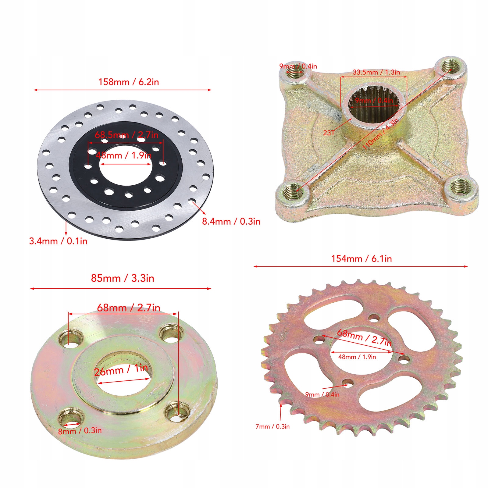 4. Полный комплект: В комплект входит задний мост диаметром 65 см, подшипники 205, фланец с 23 зубьями и четырьмя отверстиями, звездочка 428 типа 37, тормозной диск диаметром 16 см, гнездо звездочки цепи, главный тормозной цилиндр, цепь и шпилька задней оси.