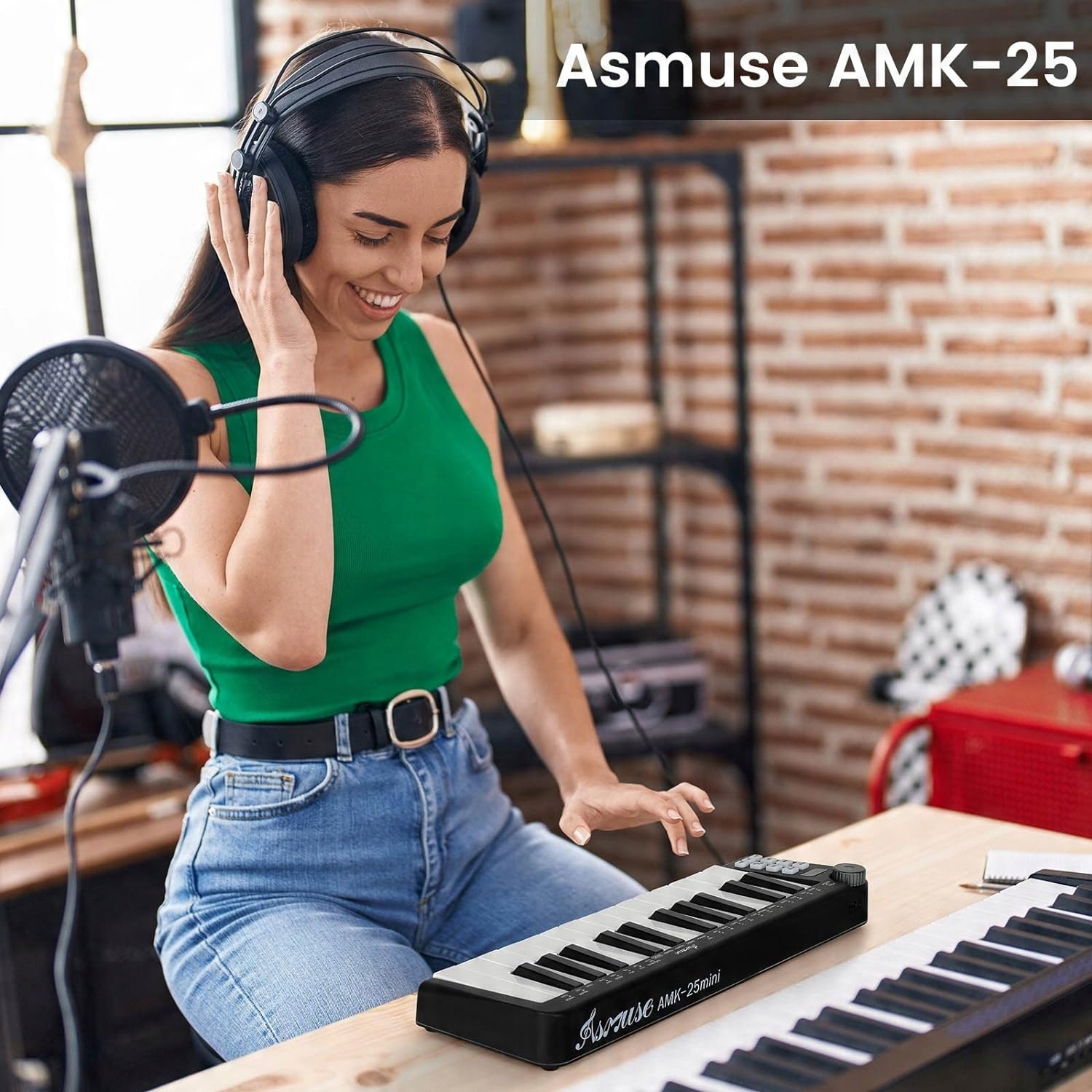 25-клавишная USB MIDI-клавиатура Asmuse, чувствительные клавиши Bluetooth, MIDI-контроллер с назначаемыми элементами управления, колесиками высоты тона и модуляции (черного цвета)
