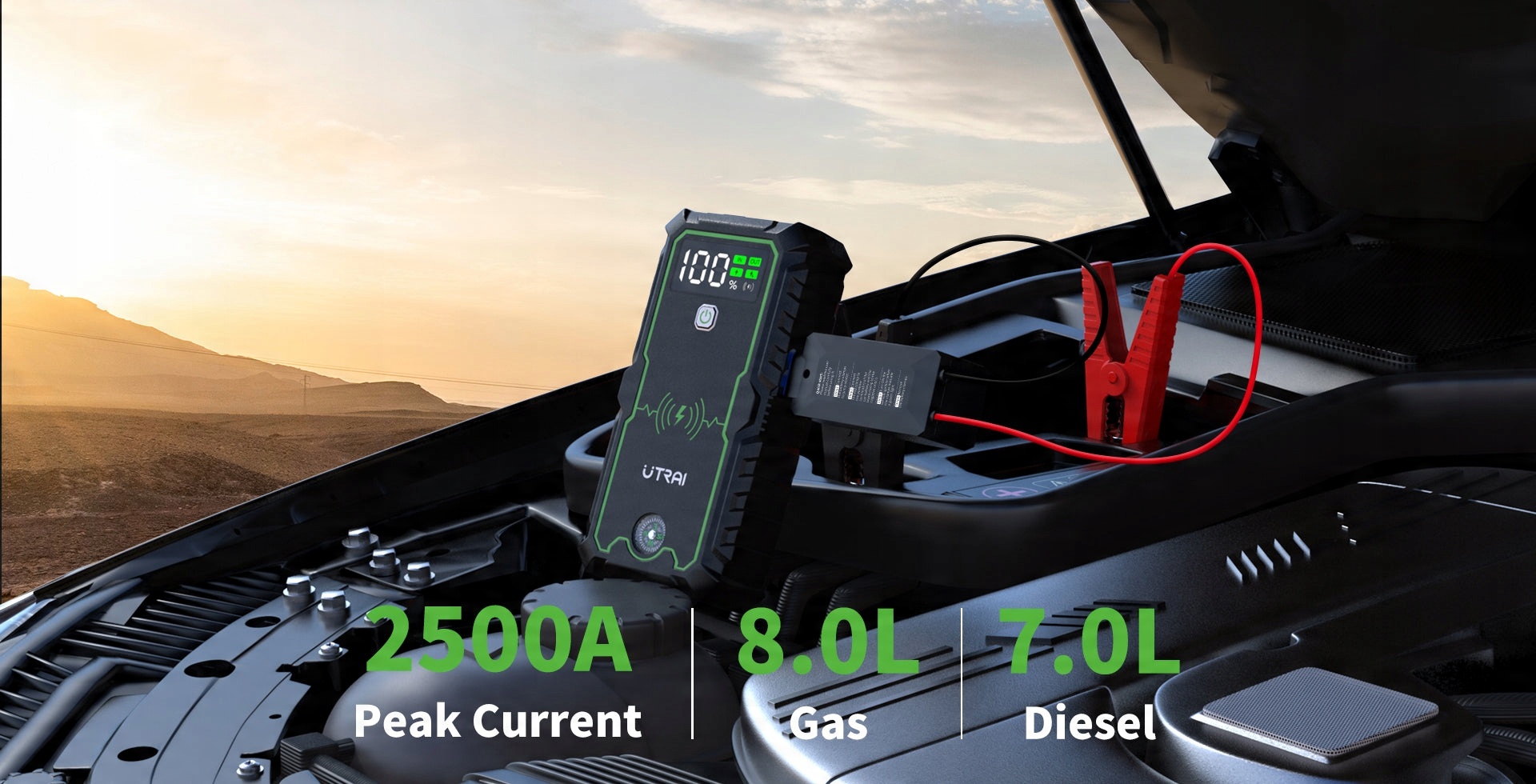 Автомобильное зарядное устройство UTRAI для запуска от внешнего источника с литиевой батареей большой емкости, пиковый ток до 2500 А, позволяет запустить большинство автомобилей с напряжением 12 В (до 8,0 л бензинового двигателя и 6,0 л дизельного двигателя), подходит для внедорожников, кемперов, фургонов, мотоциклов, снегоходов, газонокосилок и т. д.