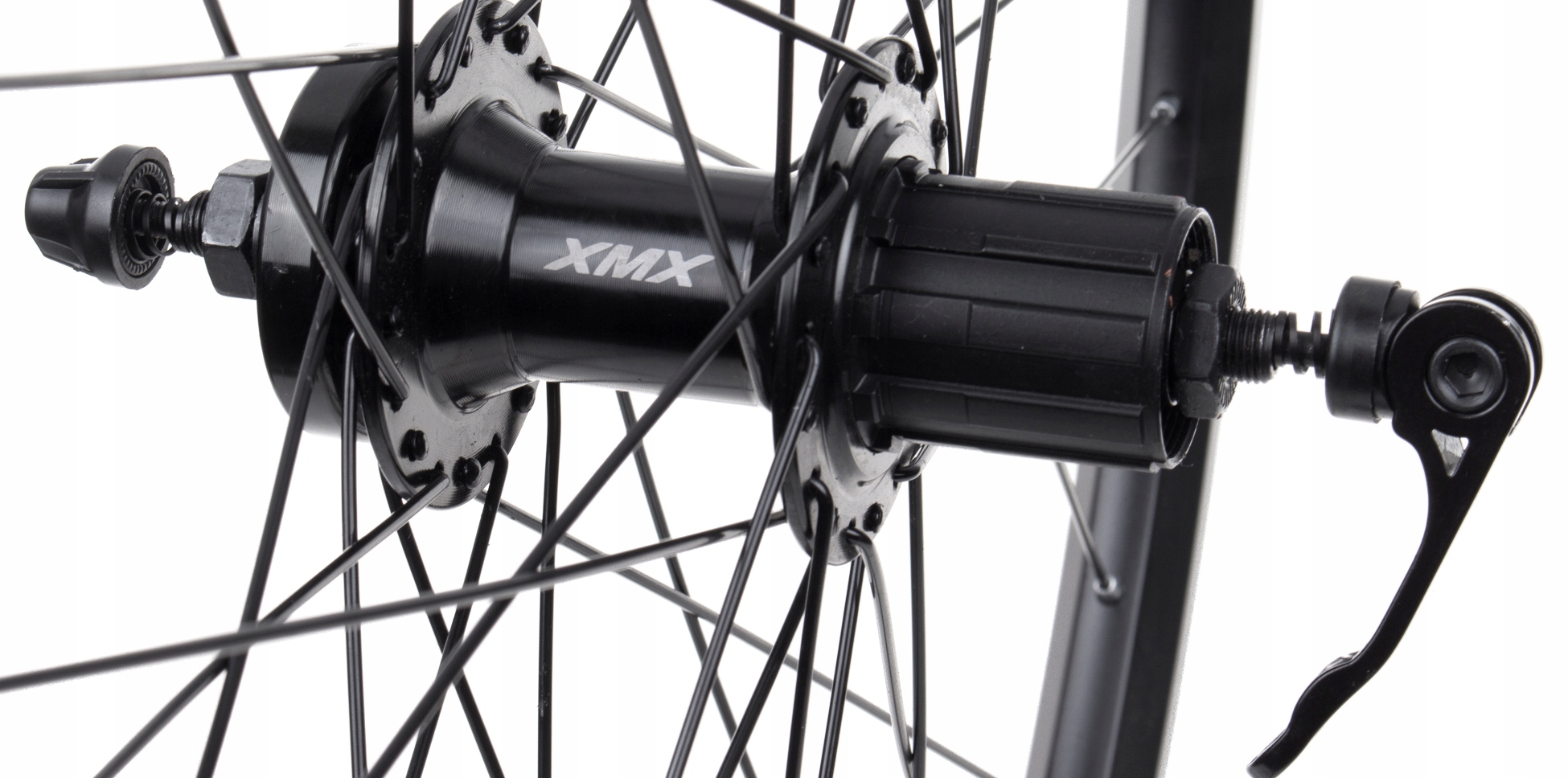 Заднее велосипедное колесо 26 дюймов, установленное на ободе XMX DISC со ступицей XMX-A282QR для 8-9-10-скоростной кассеты. Подходит для дискового тормоза с креплением IS на 6 болтов.