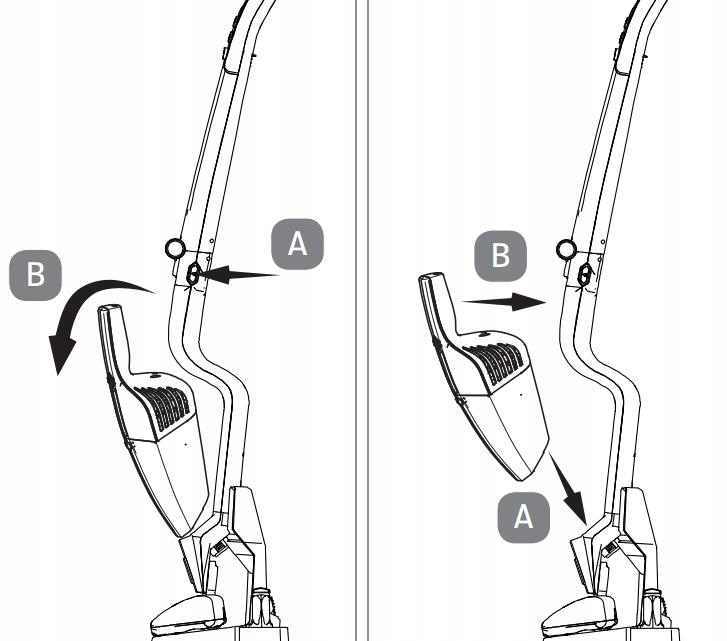Вы можете легко и быстро превратить вертикальный пылесос в ручной: просто нажмите кнопку блокировки (A), снимите ручной пылесос (B) и устройство у ручки готово к работе.