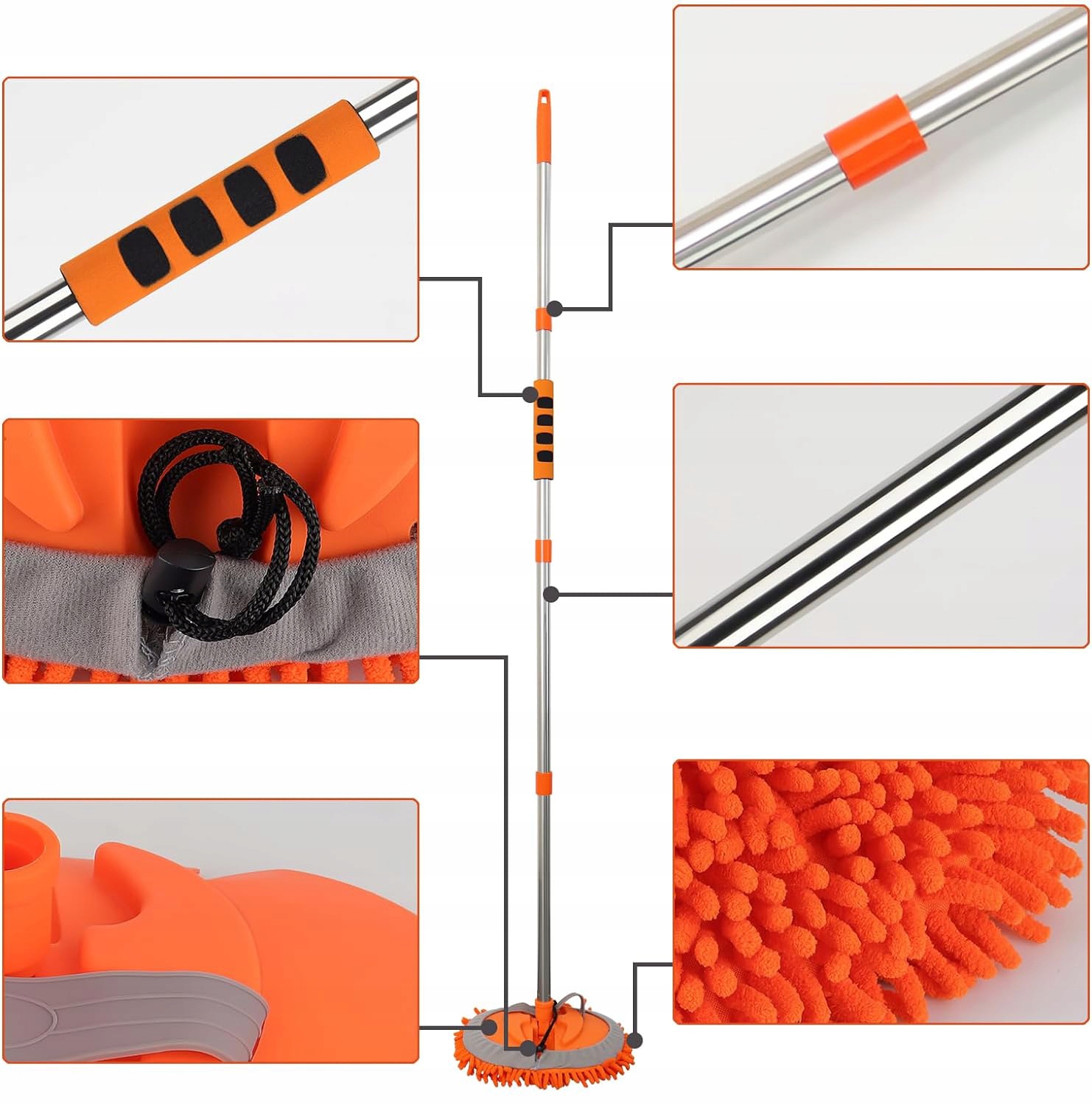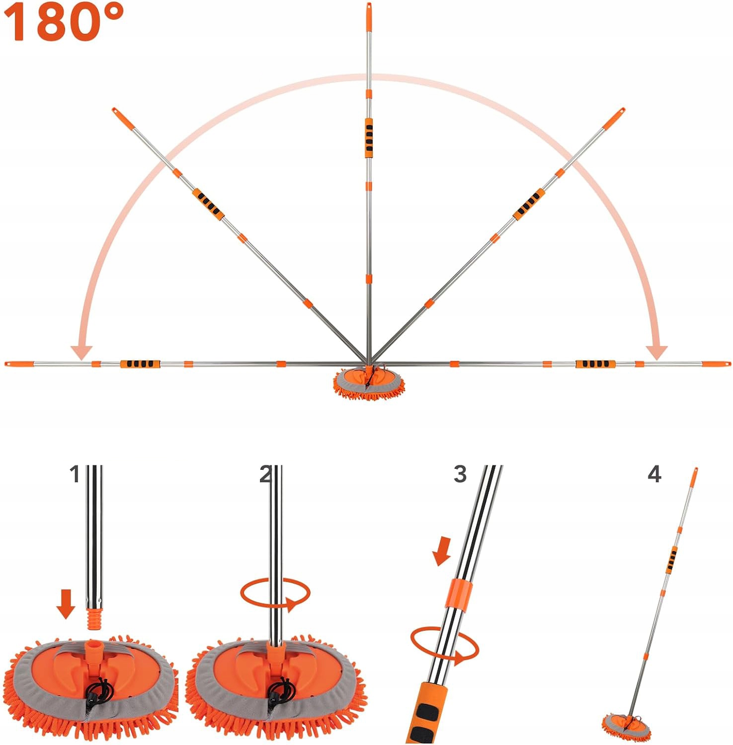 Ручка регулируется, телескопические стержни с 4 частями длиной 62 дюйма, что поможет вам почистить большинство мест, которые вы не можете достичь , Спасибо, на что вы не будете напрягать свою спину. Он имеет ручку без скольжения и предлагает 180-ступенчатый угол очистки для легкой очистки.