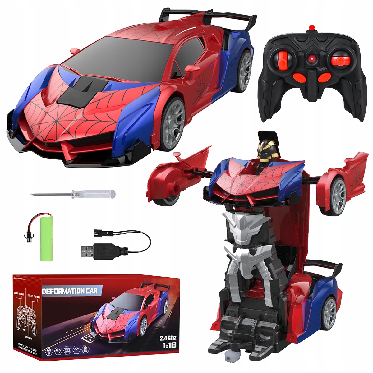 Машинка на дистанционном управлении для мальчиков и девочек 3, 4, 5, 6, 7, 8+ лет, радиоуправляемый робот-трансформер Spider 2,4 ГГц, масштаб 1:18 с пультом, новогодний подарок для детей 3-12 лет (красный-синий)