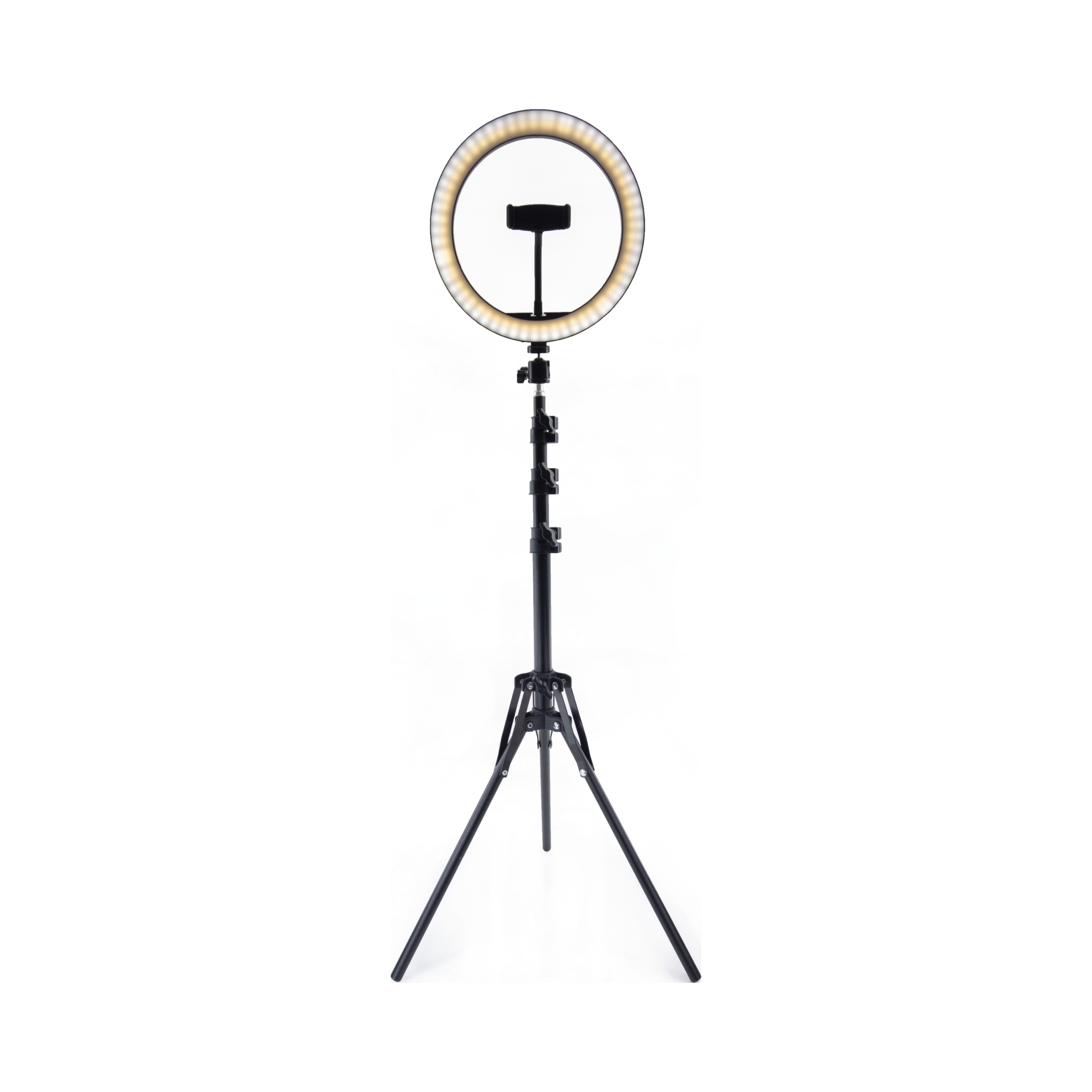 В центральном месте кольцевой лампы расположен держатель для устройства максимальной шириной 85 мм. Он имеет гибкое расширение, благодаря которому вы можете расположить смартфон под разными углами. Это очень полезно для людей, делающих селфи (например, демонстрирующих макияж), а также для фотографирования продуктов и натюрмортов.