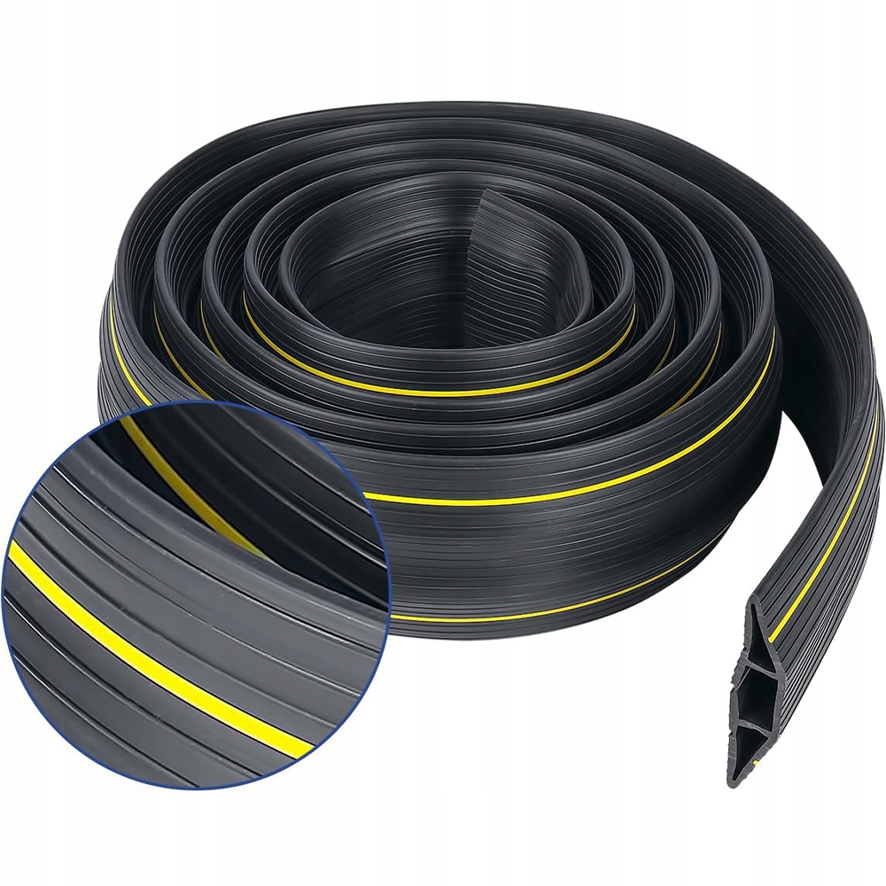 Две ярко -желтые полосы на вид наверху увеличения, служащие четким предупреждением, чтобы предотвратить случайные спотыкания или разрушение кабеля.