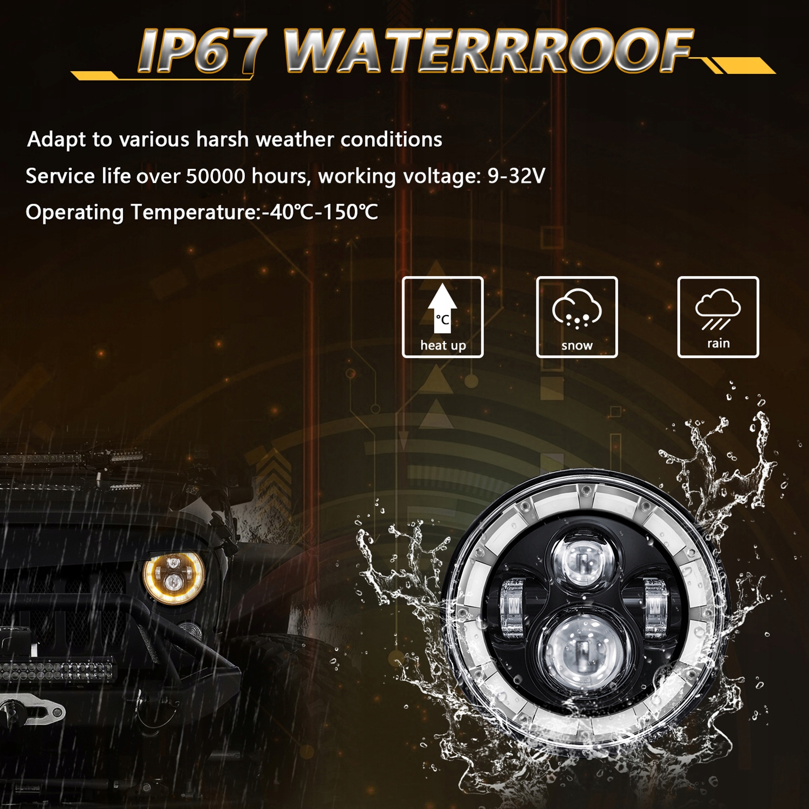 1. Высококачественный прожектор: 7-дюймовый светодиодный прожектор изготовлен из литого под давлением алюминия, прочный и долговечный, а также обладает отличными характеристиками рассеивания тепла, полностью закрытый и эффективный водонепроницаемый, поэтому срок службы этого 7-дюймового светодиодного прожектора составляет более 50 000 часов. Вентиляция на задней стороне корпуса лампы позволяет эффективно удалять туман.