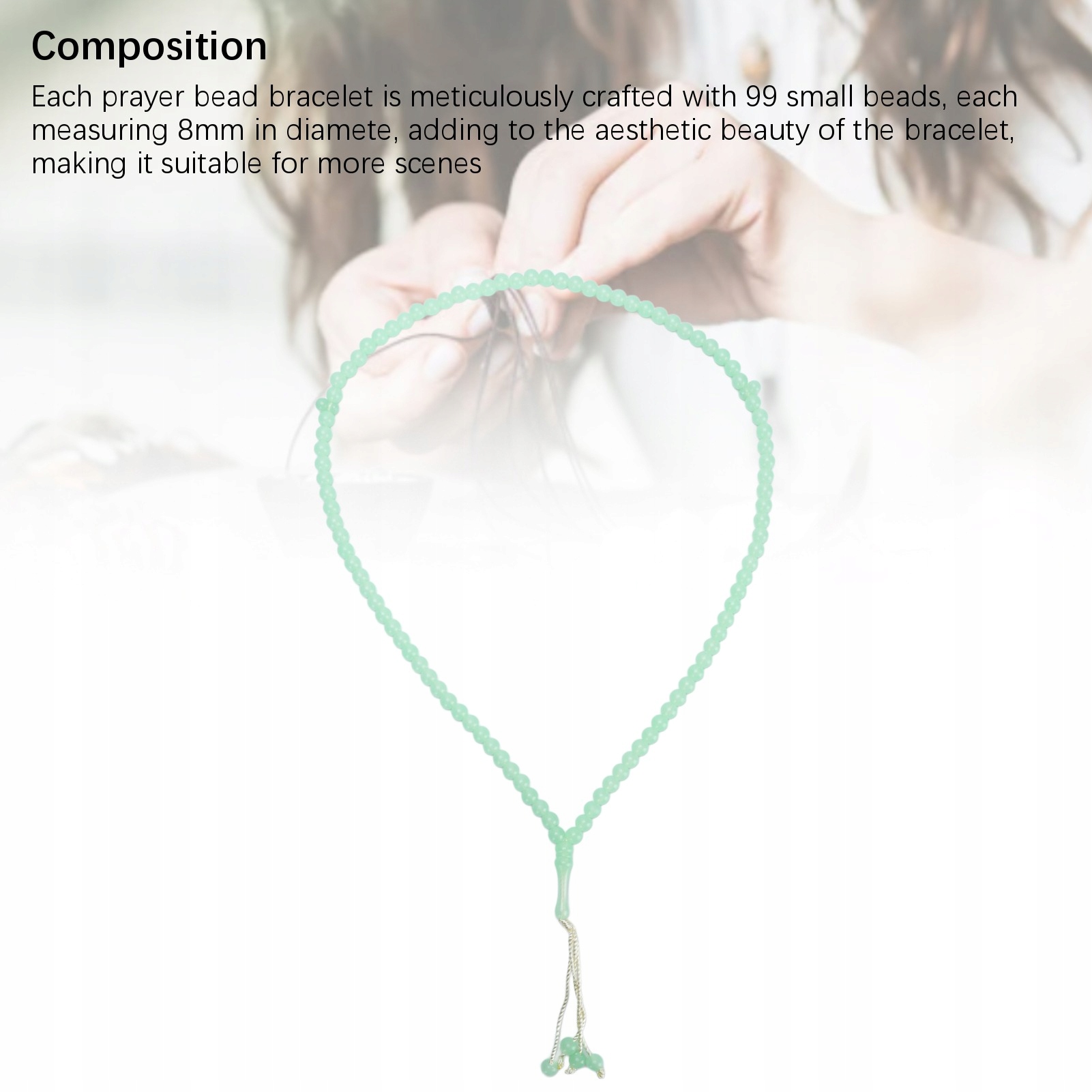1. Композиция: каждый браслет из молитвенных бусин тщательно изготовлен из 99 маленьких бусин, каждый с диаметром 8 мм, добавляя эстетическую красоту браслета, что делает его подходящим для большего числа сцен p>