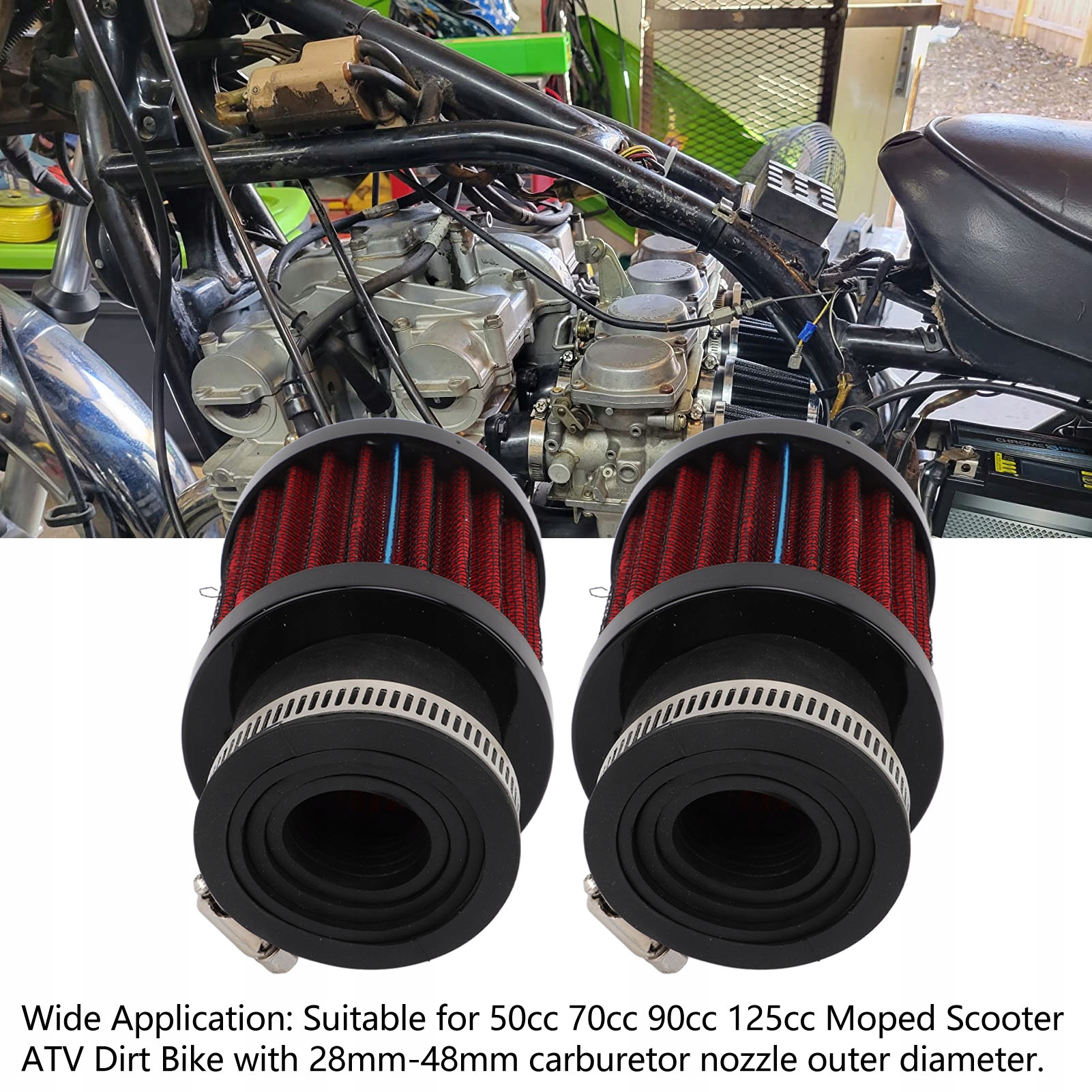 2. Совместимость по ширине: Air CleNaEaner с регулируемым зажимом подходит для мопеда-самоката ATV объемом 50 куб.см, 90 куб.см, 90 куб.см, 125 куб.см с насадкой карбюраторного сопла диаметром 28–48 мм.