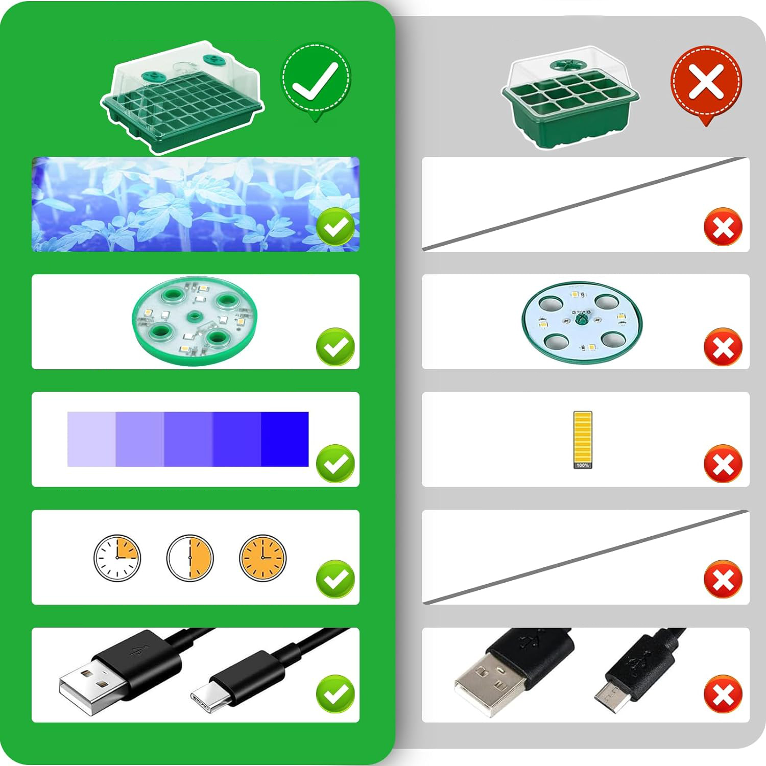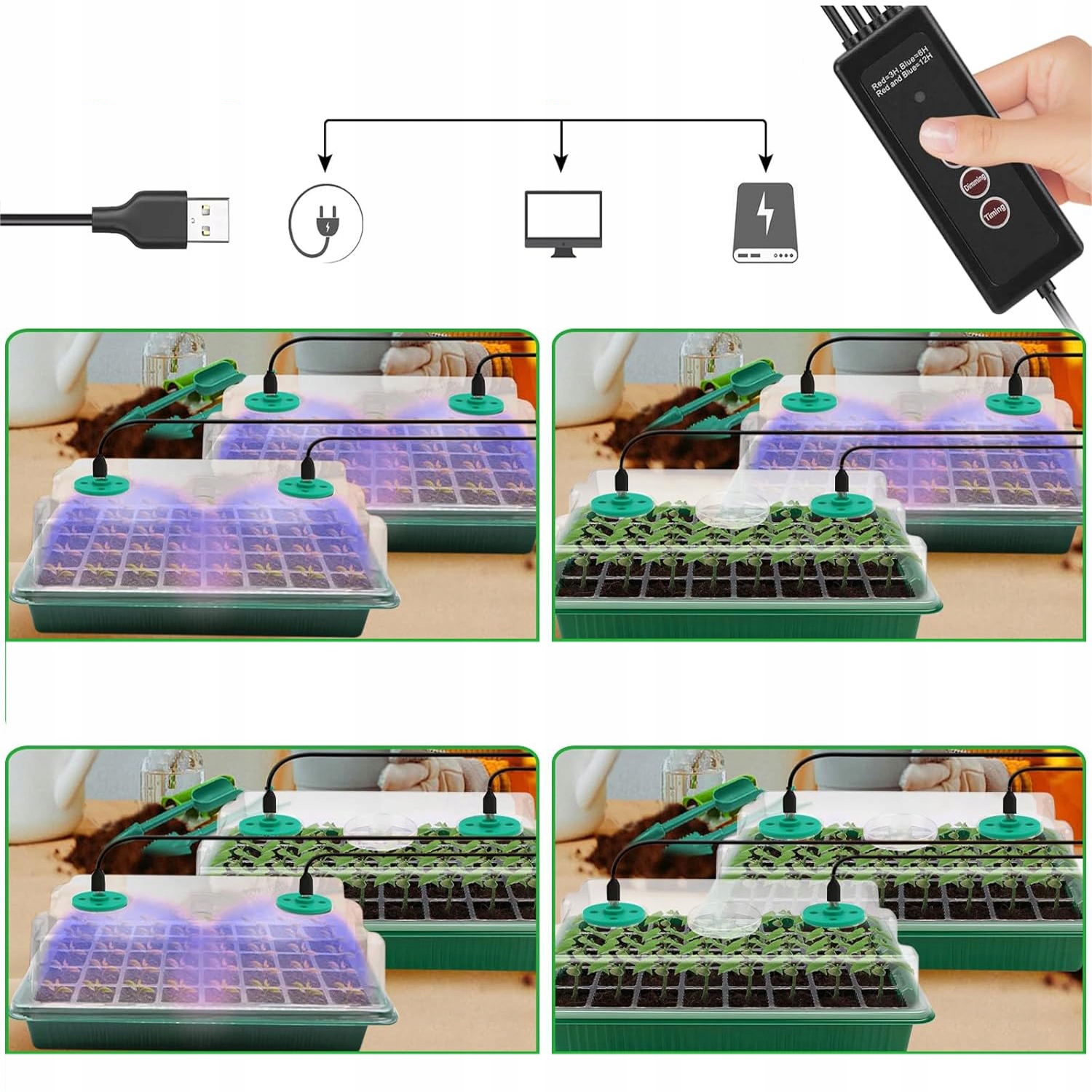 Этот лоток для семян оснащен светодиодной лампой для выращивания растений (с питанием от USB), которая обеспечивает освещение растений на всех стадиях роста. Этот стартовый комплект для посева оснащен 8 светодиодными лампами полного спектра. У нас есть большое количество ламповых бусин, по 8 ламповых бусин в каждом светильнике для выращивания растений, всего 32 ламповых бусин, которые полностью освещают каждое семя, как естественный солнечный свет.