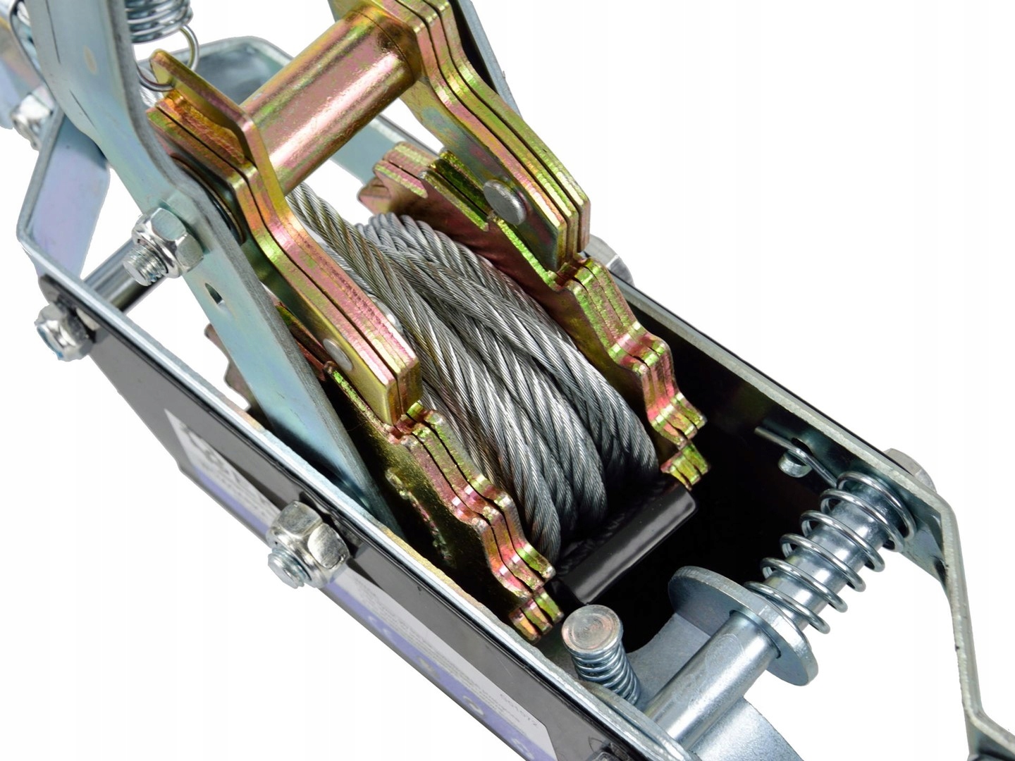 Лебедка оснащена 2-режимным механизмом блокировки, стальным тросом диаметром 4,5 мм и длиной 2,5 м. >, который в сочетании с прочными крюками создает тяговое усилие 2000 кг.