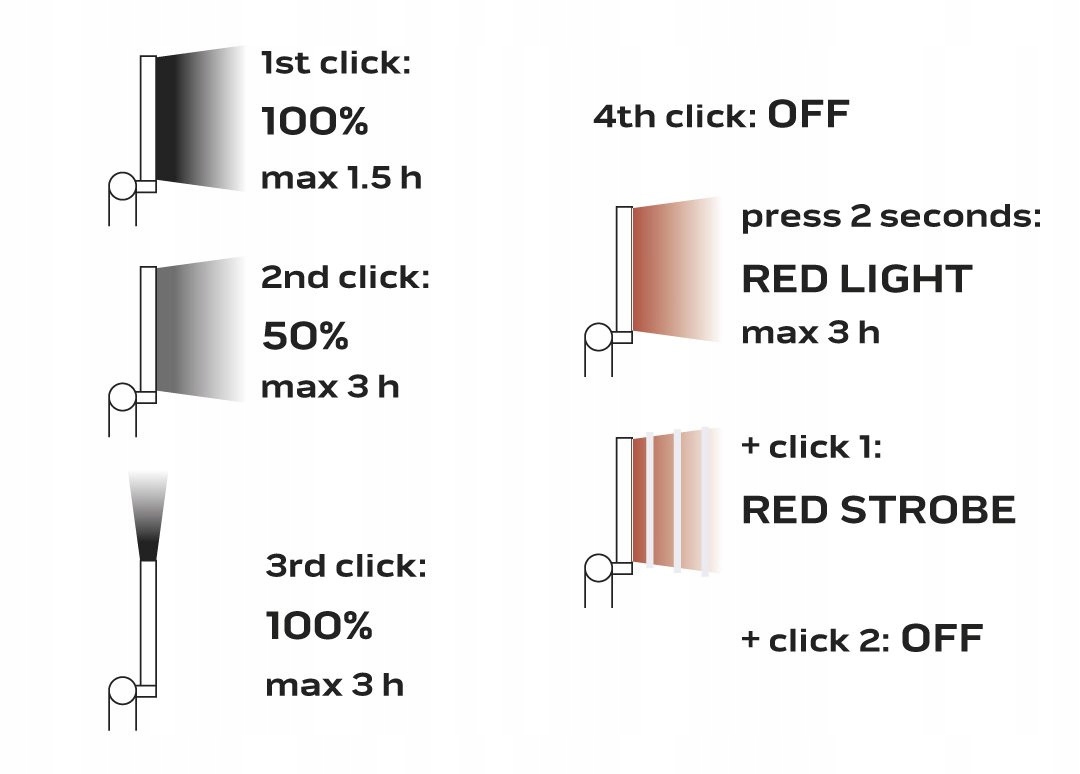 • Рабочие режимы: фонарик, 100% лампа, 50% лампа, Лампа красный, лампа красный строб