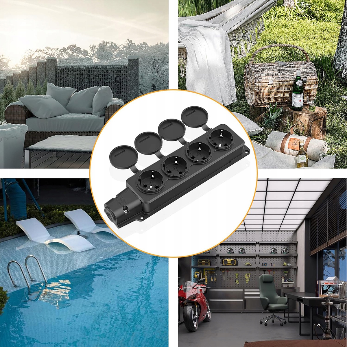 Приложение 2 Водонепроницаемые внешние розетки, внешний розетка с 4 часами с шарнирными крышками, силовая полоска до влажных комнат, внешний гнездо IP54 для сада, снаружи, до влажных комнат, 16A/250 В 3500 Вт, черный (без кабеля) Ding