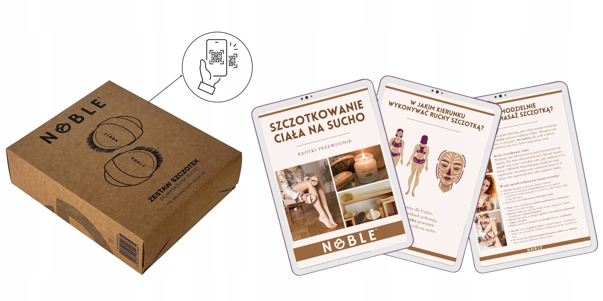 К щетке прилагается краткое руководство по чистке и типам щеток для сухого массажа NOBLE®. Более подробную информацию вы можете получить, отсканировав QR-код на упаковке щетки — скачайте электронную версию руководства производителя о том, как расчесывать тело и подобрать подходящую щетку для каждой части тела.