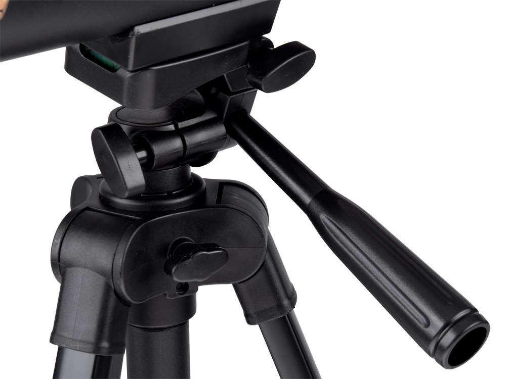 Алюминиевый штатив высотой 1,3 м обеспечивает устойчивость, а его конструкция позволяет плавно поворот телескопа на 360° и регулировку угла наклона. Благодаря фиксаторам и регулировкам телескоп можно легко настроить под условия наблюдения.
