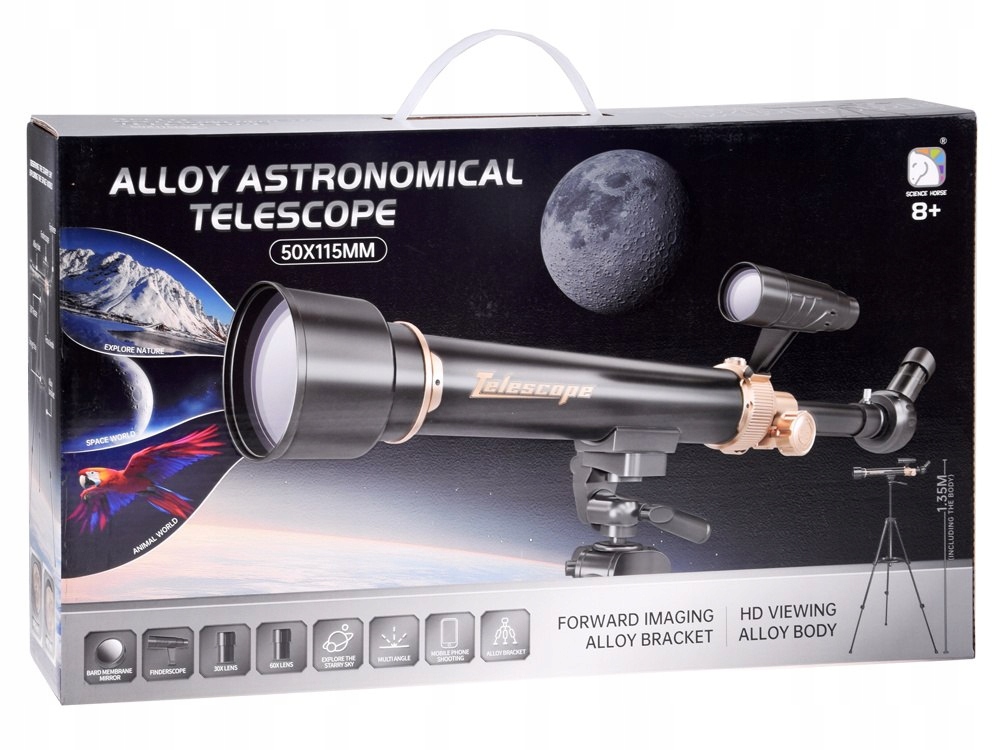 Астрономический телескоп с 30-кратным и 60-кратным увеличением — отличный выбор для людей, начинающих свое приключение с наблюдения за небом, а также для энтузиастов, ищущих надежный и полный комплект. Благодаря фокусному расстоянию 500 мм он позволяет снимать детали поверхности Луны, наблюдать за планетами, звездами и другими небесными телами. Специальное мембранное зеркало Барда дополнительно обеспечивает безопасное наблюдение за Солнцем.