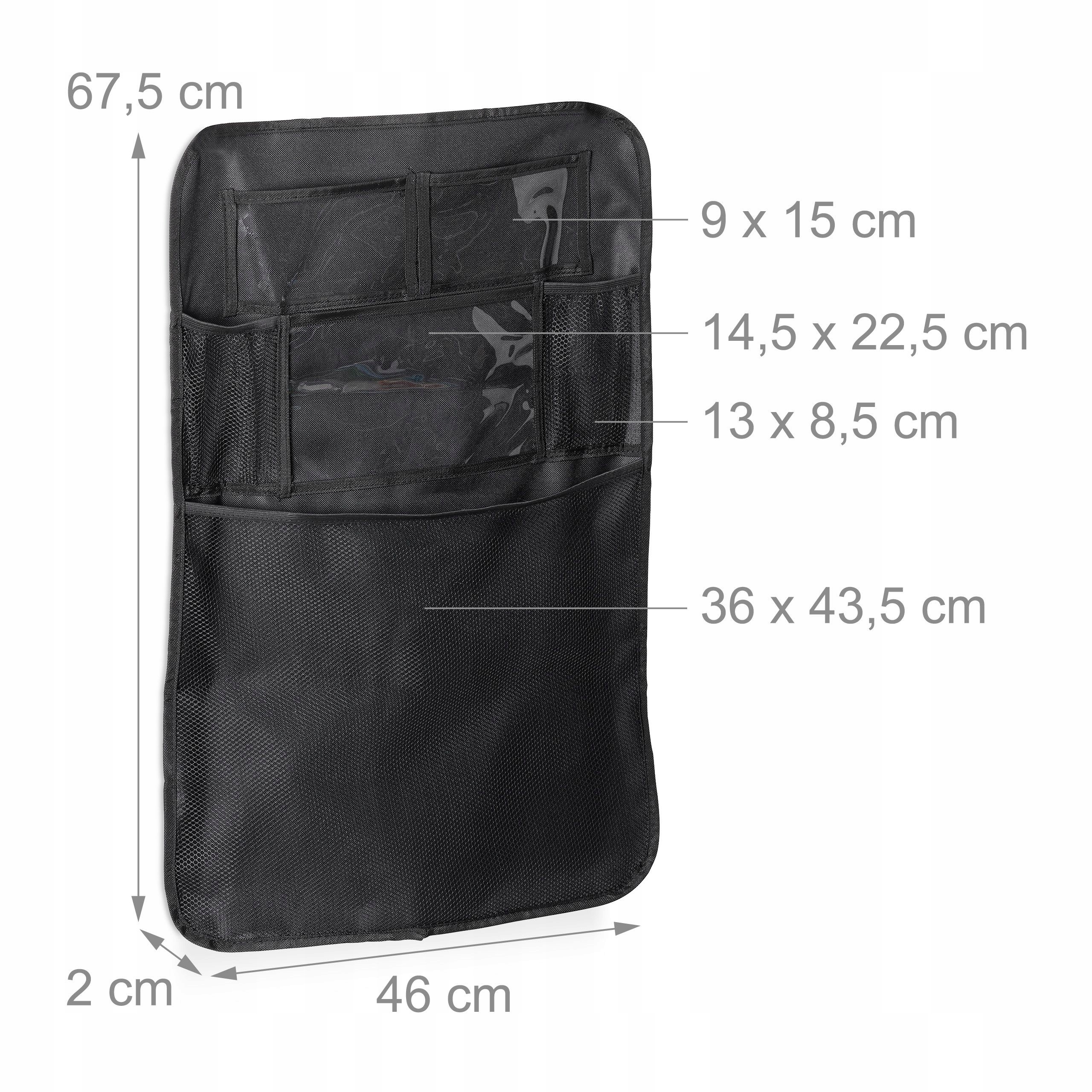 - Основы: Черный органайзер на заднем сиденье - В x Ш: примерно 67,5 x 46 см - с 2 ремнями для крепления к сиденью.