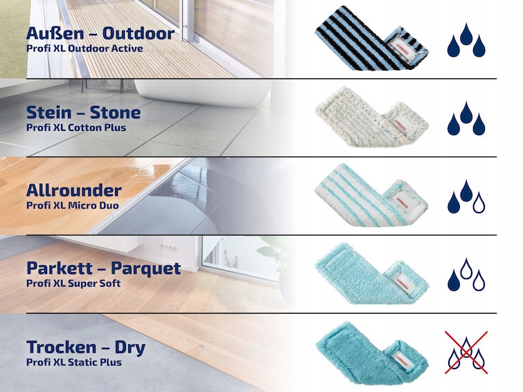 Система Leifheit Profi позволяет использовать множество отличных подушечек для швабр для всех типов полов. Высочайшее качество и выбор, который удовлетворит самого требовательного покупателя – вот те характеристики, которые характеризуют не только сменные чехлы для швабр, но и всю продукцию немецкого производителя.