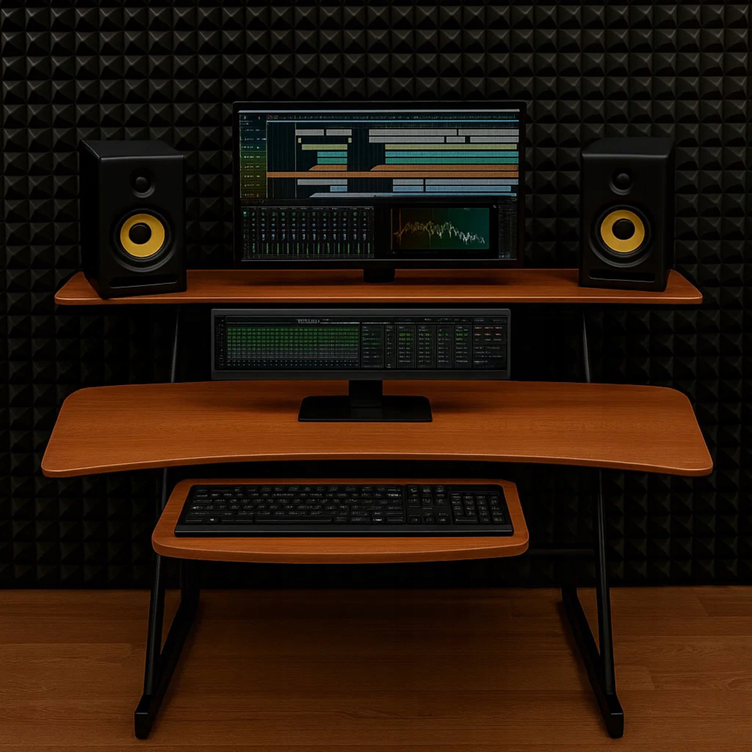 - Тип: студийный стол, рабочее место со столешницей, полкой для аудиоаппаратуры и выдвижной полкой для клавиатуры