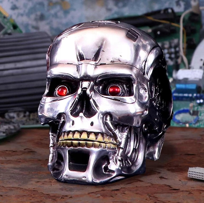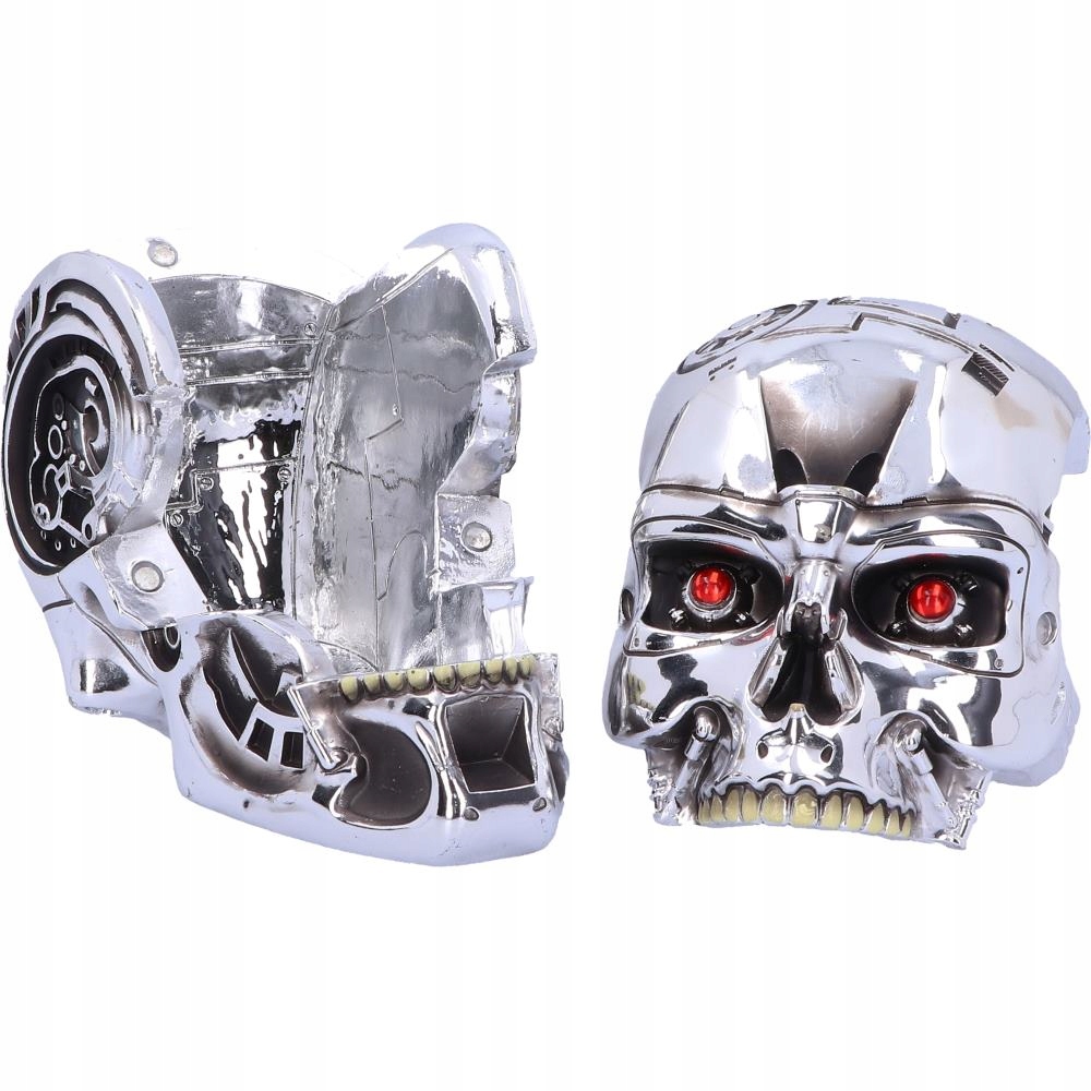 Этот официально лицензированный продукт, отправленный в прошлое из будущего, входит в подарочную коллекцию альтернативного бренда Nemesis Now. Эта Голова Терминатора Т-800 лишилась всего человеческого тела, обнажив гидравлику, наложенную на металлическую скелетную структуру, которая издевается над человечеством. Красные глаза смотрят прямо перед собой, не мигая. Переднюю часть черепа можно снять, чтобы открыть удивительно вместительное место для хранения вещей.