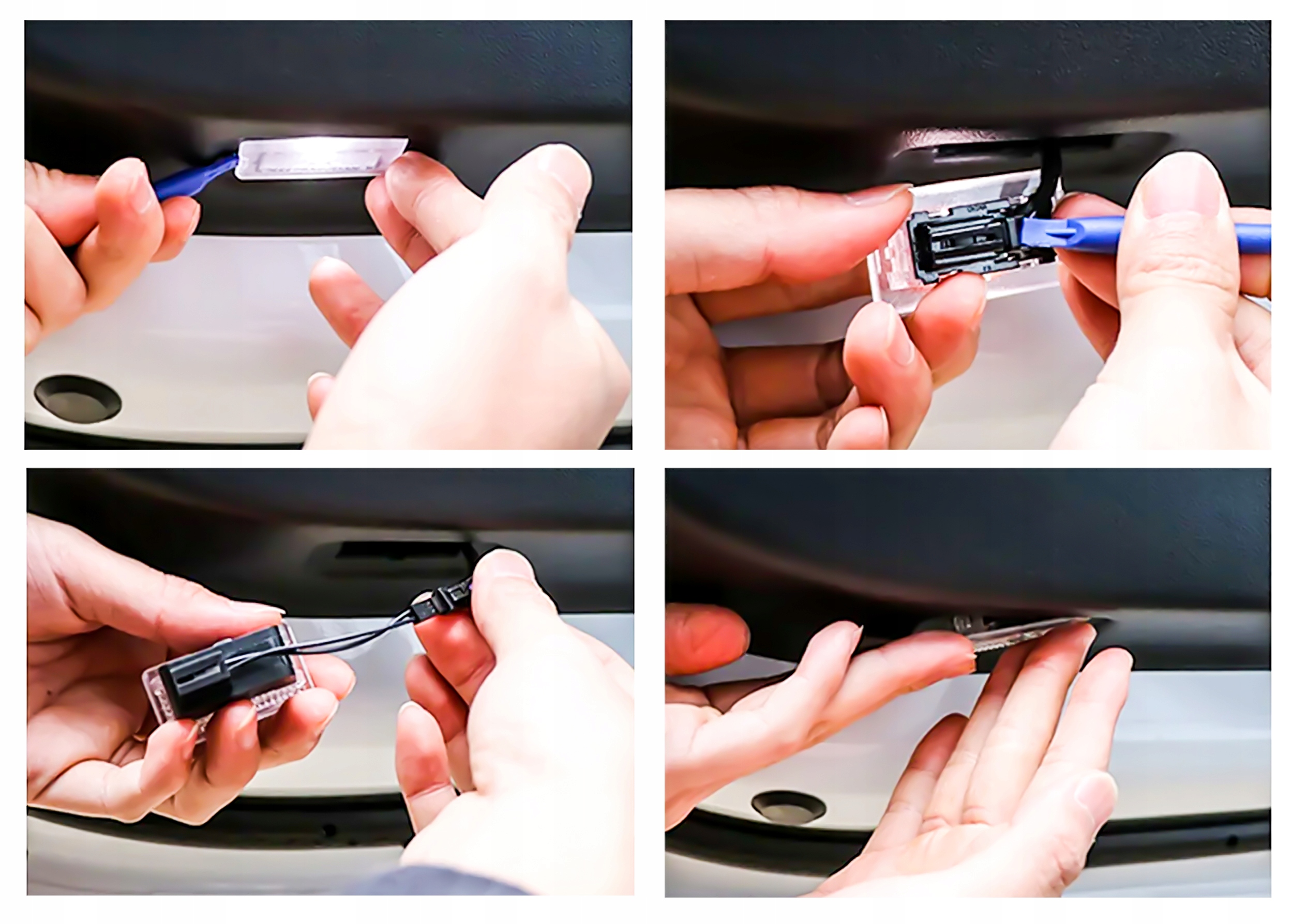 - 1️⃣Снимите заводскую лампу, расположенную в двери