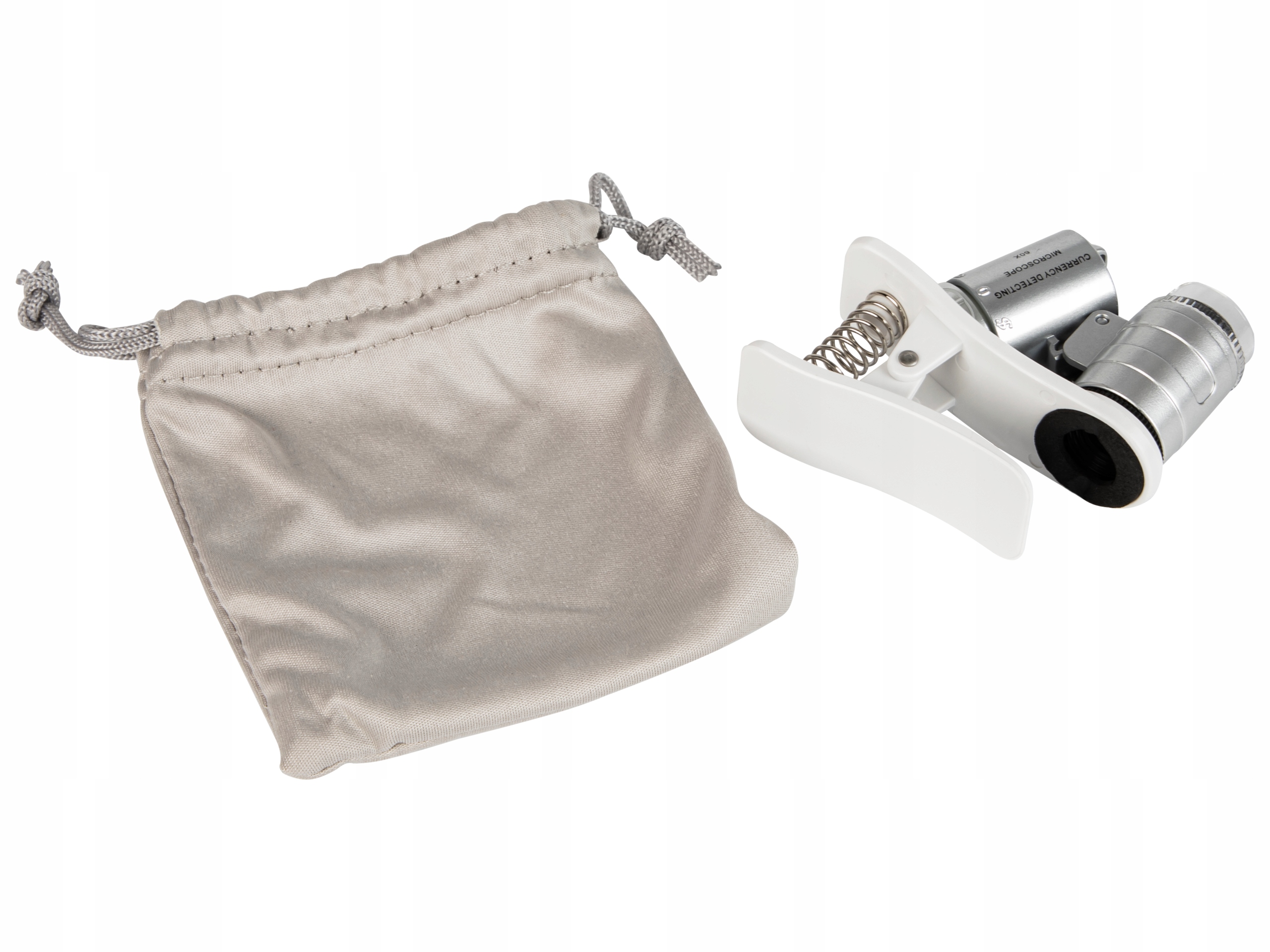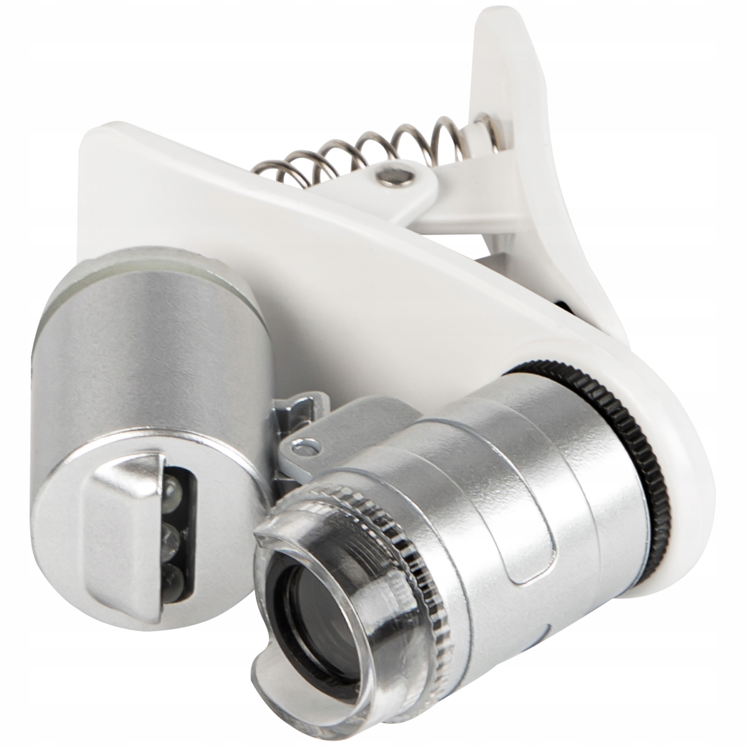 Микроскоп с белой или ультрафиолетовой подсветкой, предназначенный для встроенных камер мобильных телефонов. К выдвижной линзе прикреплен специальный пружинный зажим, который позволяет прикрепить изделие к сотовому телефону, а благодаря пенопласту, расположенному в месте соединения зажимов, корпус телефона не должен быть каким-либо образом поврежден. Продукт ориентирован в основном на любителей фотографии, так как обеспечивает зум до 60х, но спектр его применения гораздо шире и он отлично подойдет, например, когда нужно внимательно рассмотреть различные виды товаров. В комплект также входит специальная сумка, которая облегчит транспортировку устройства.