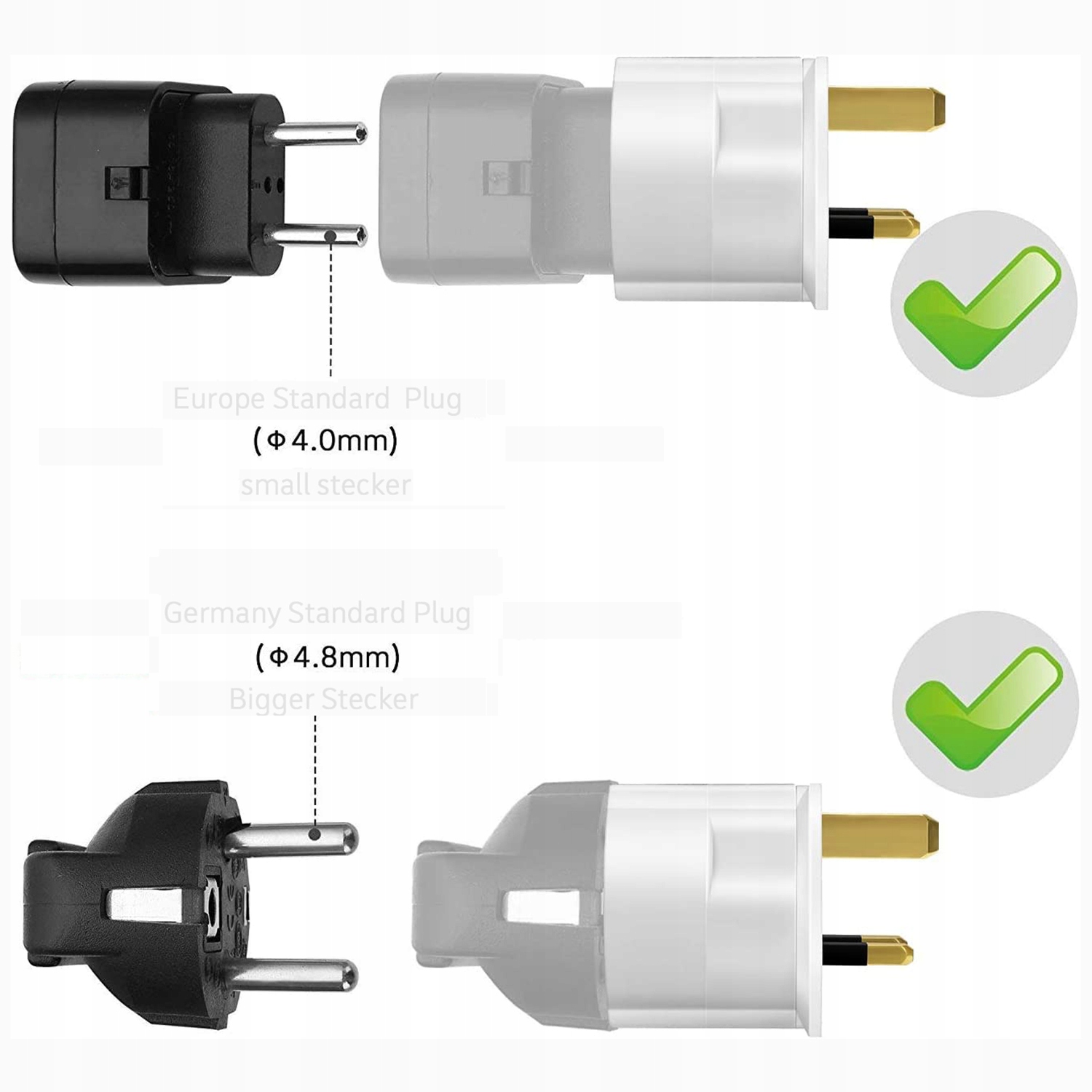 Компактный и надежный: 2-контактная европейская вилка от Польши до 3-контактной британской вилки оснащена предохранителем на 13 А для максимальной мощности 3250 Вт.