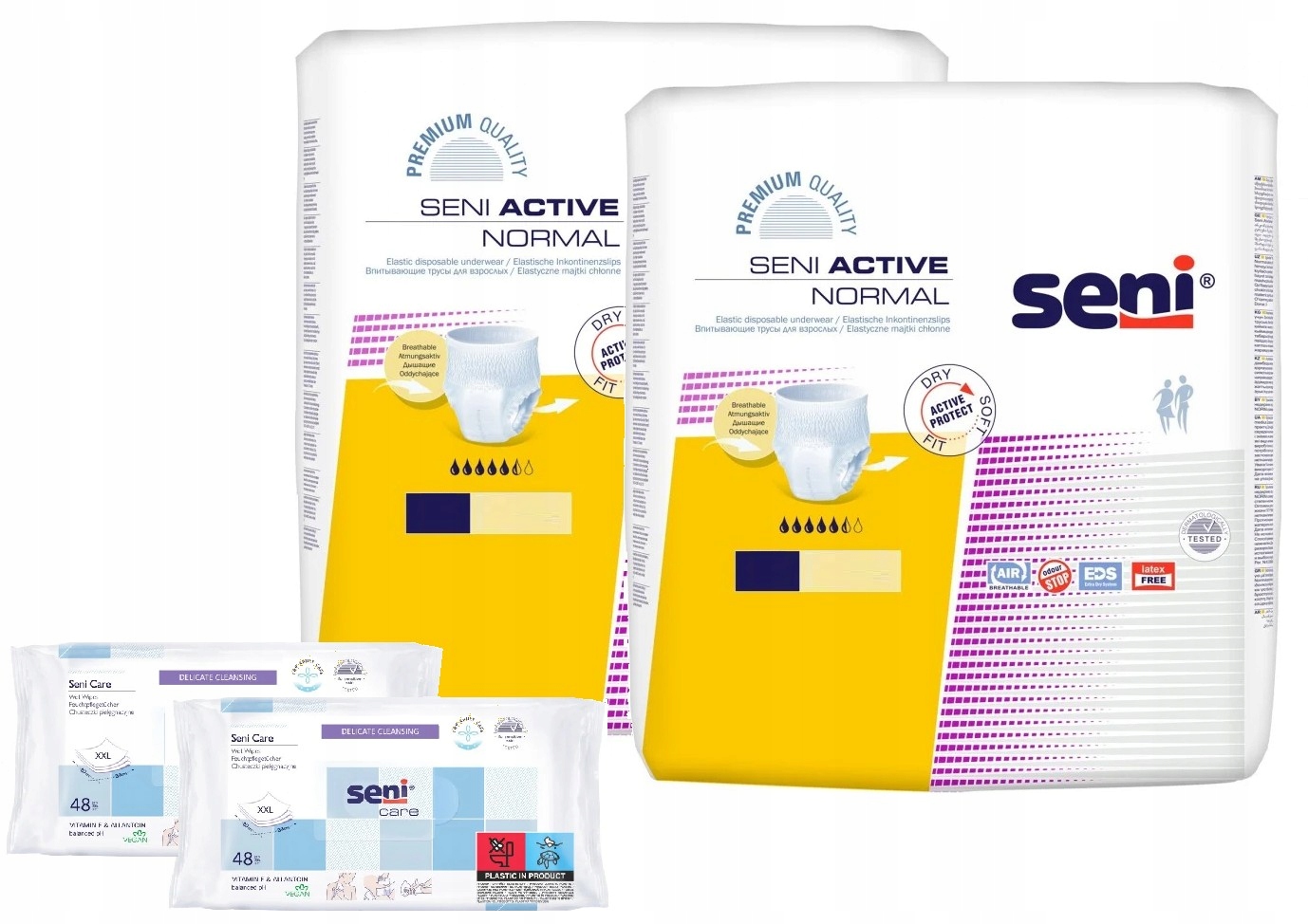 В комплект входят 2 упаковки впитывающих трусиков Seni Active Normal размера XL, в упаковке по 30 штук и две упаковки влажных салфеток Seni Care по 48 штук
