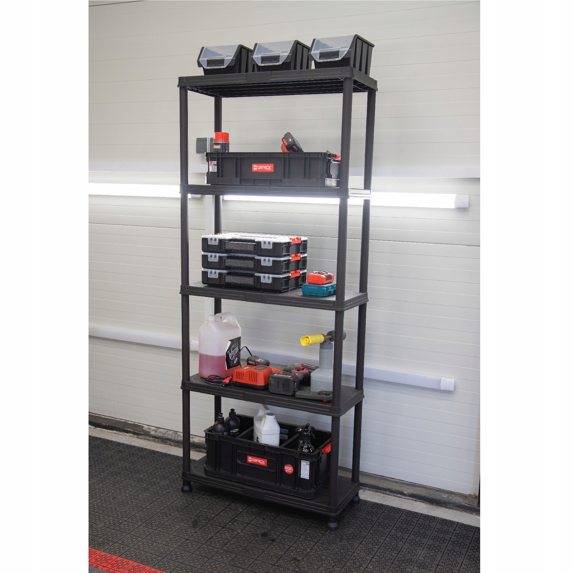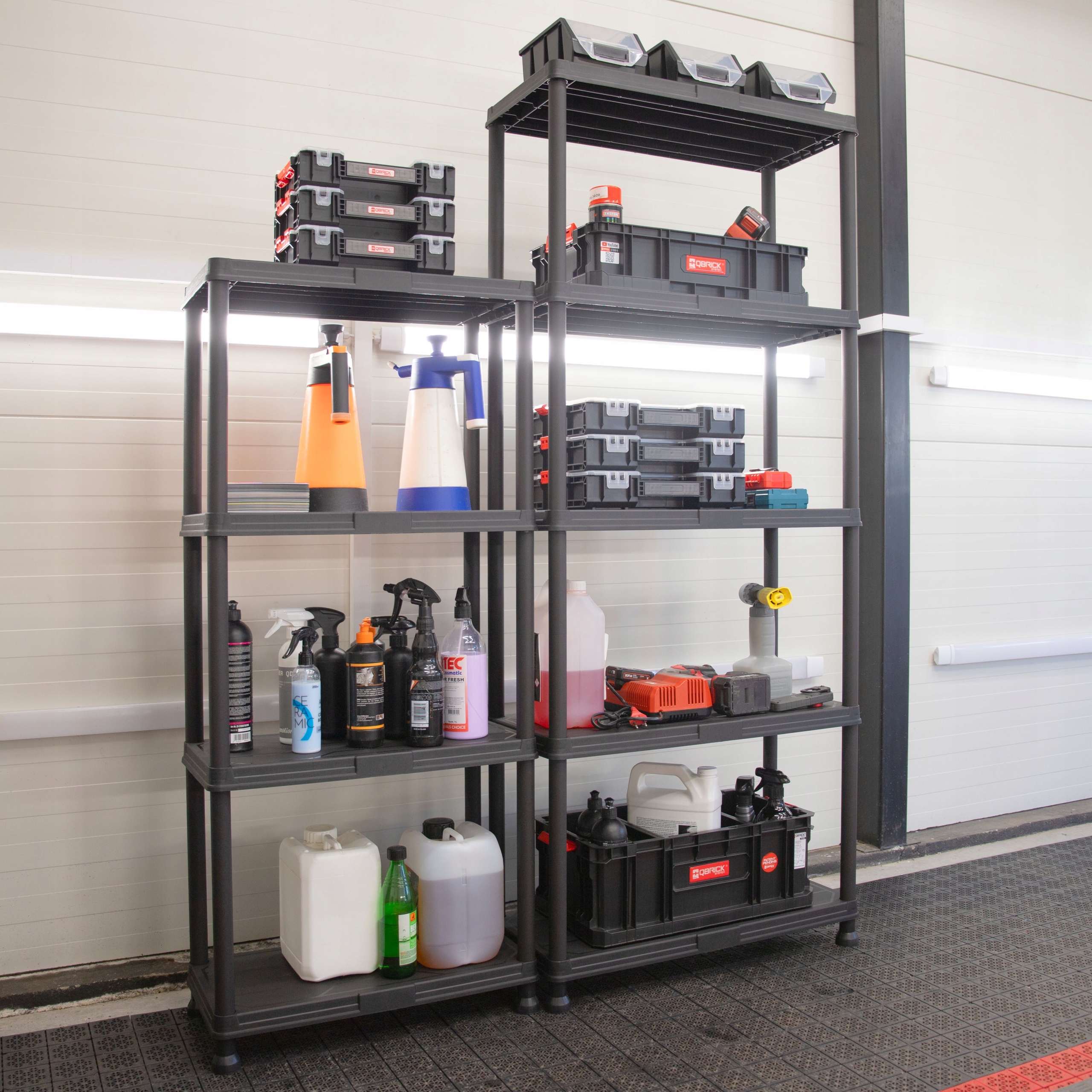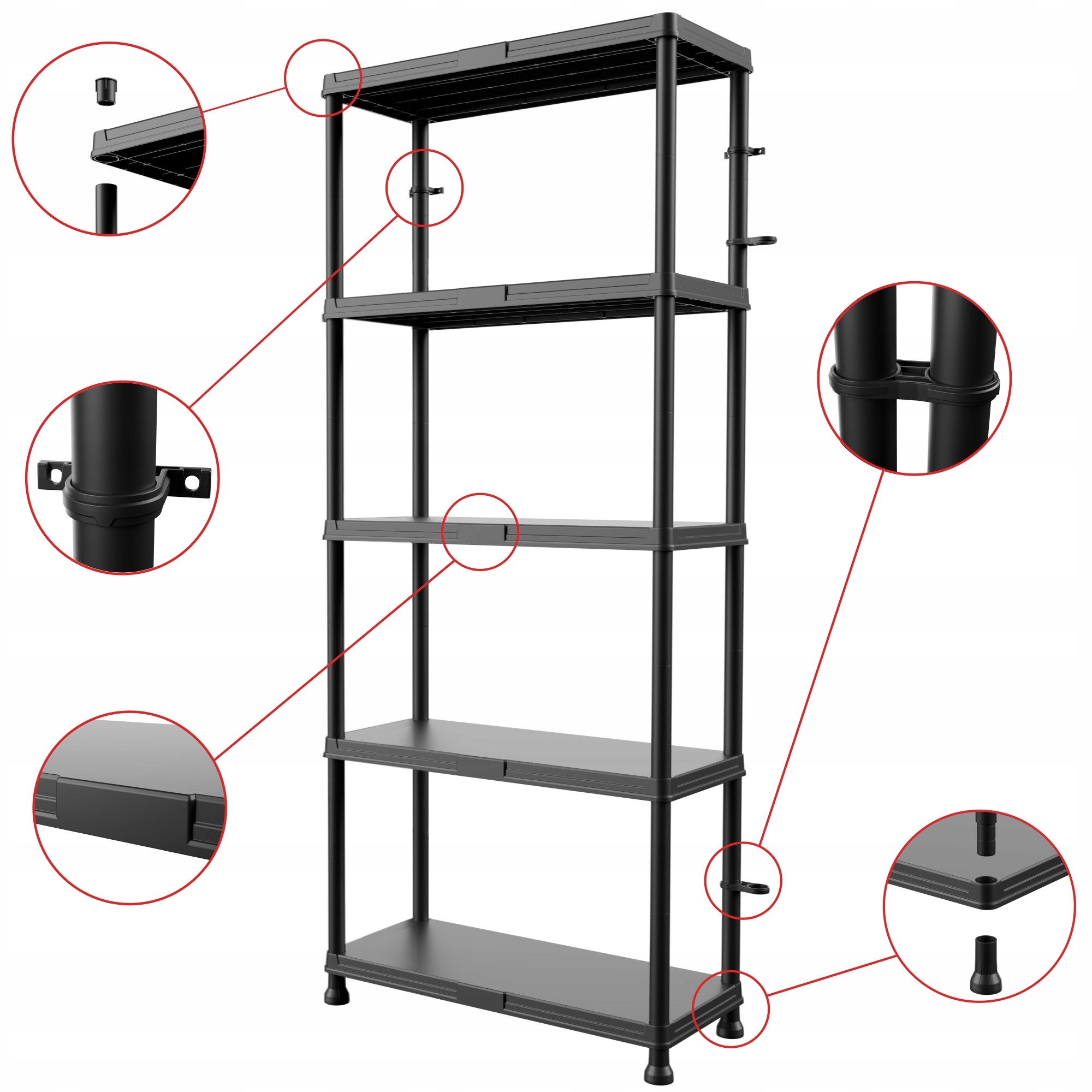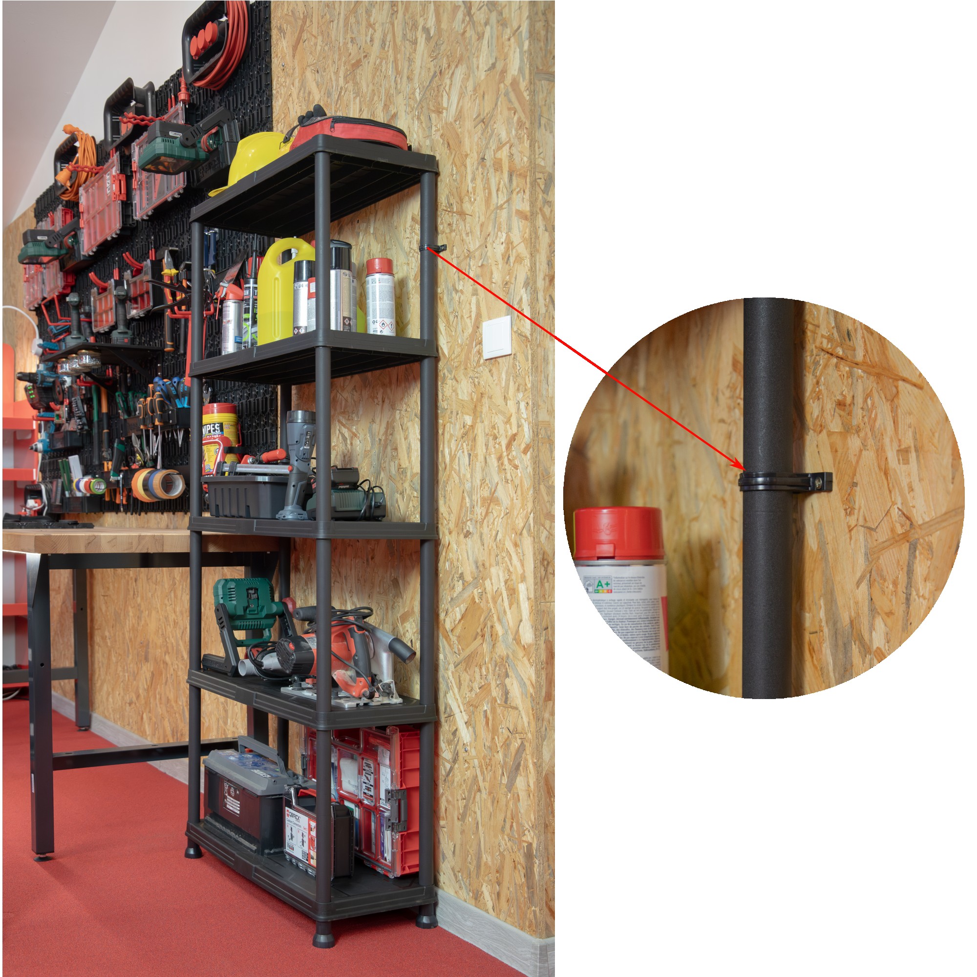 полка изготовлена из постоянного пластика , который характеризуется высоким сопротивлением влаги , переменными температурами и механическим повреждением. Это означает, что его можно размещать без страха в подвале, где есть определенные условия или в мастерской, где он подвергается частому контакту со смазочными материалами, маслами, а также с инструментами или другими тяжелыми предметами.