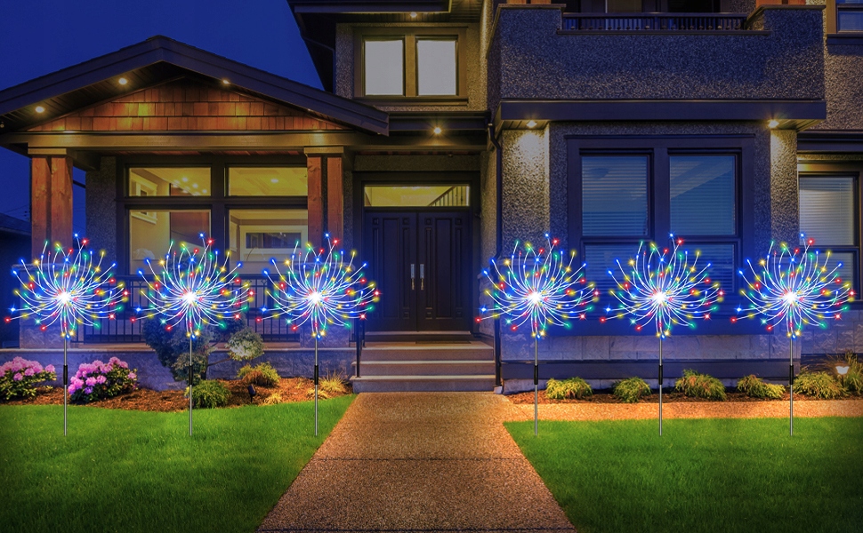 Солнечный фейерверк имеет два режима освещения. Когда переключатель установлен в положение «ВКЛ», это мигающий режим, переключатель находится в состоянии «ВЫКЛ» в среднем положении, а положение «ВЫКЛ» — в режиме постоянного освещения. Это креативный подарок друзьям или соседям на Рождество, Хэллоуин и День Благодарения. Это наружное декоративное освещение будет освещать террасы, клумбы, сады, дворы, заборы, дорожки и дорожки и т. д.