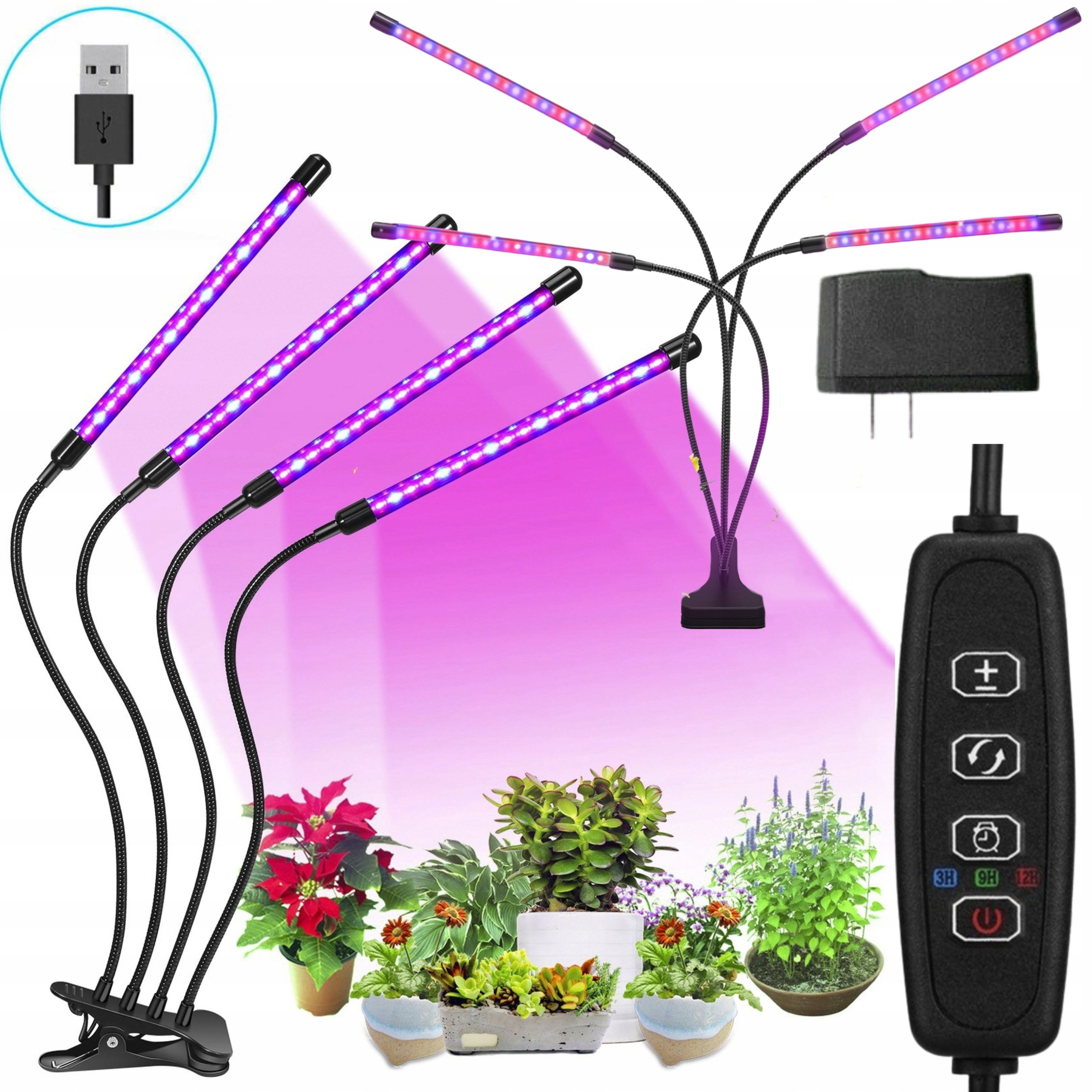 СВЕТОДИОДНАЯ ЛАМПА ДЛЯ РОСТА РАСТЕНИЙ, 4 ГОЛОВКИ, ТАЙМЕР ДЛЯ ВЫРАЩИВАНИЯ ЦВЕТОВ, МОЩНЫЙ
