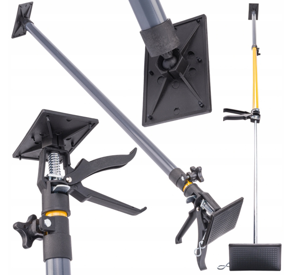 Опора будет использоваться при монтаже потолочной/настенной плитки (гипсокартона) под неудобным углом или при ремонте склеенных поверхностей. Телескопическая функция позволяет регулировать высоту, а наклоняемые прижимные пластины обеспечивают устойчивое крепление.