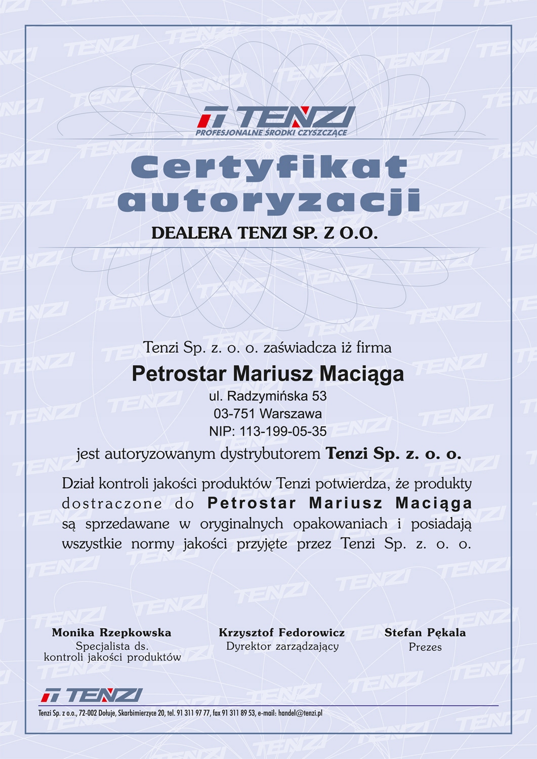 Tenzi — польский производитель профессиональной химии, компания существует с 1999 года и является значимым игроком индустрии профессиональных чистящих средств во многих странах. Тензи создает продукцию в трех основных отделах: гигиеническом (чистящие средства для помещений), авто (средства для чистки и ухода за автомобилями) и гастрономическом (препараты для гигиены в гастрономии).