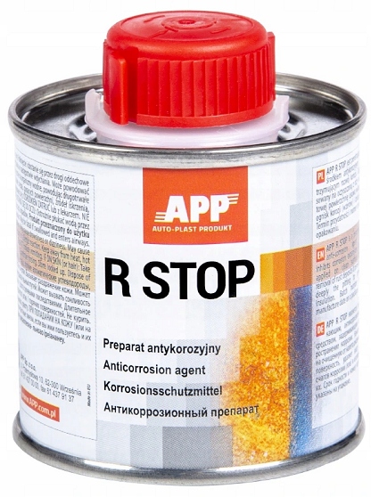 APP R Stop – антикоррозионное средство проникающего действия, останавливающее развитие коррозии. При нанесении на очищенную от ржавчины поверхность удаляет влагу из очагов коррозии (ямок) и изолирует их. Продукт готов к использованию и подготовлен к нанесению кистью или распылением. Пропитанные поверхности можно покрывать полиэфирными продуктами и 1- и 2-компонентными грунтовками. Продукт реагирует с влагой. После использования плотно закройте упаковку.