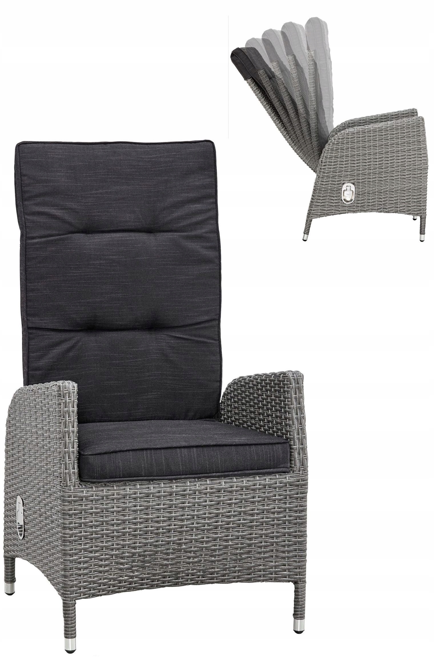 Благодаря возможности регулировки спинки вы можете удобно сидеть и полностью расслабиться. . Садовое кресло, изготовленное из устойчивого к атмосферным воздействиям полиэтиленового ротанга, легко чистится, долговечно и подходит для повседневного использования. Стальной каркас с порошковым покрытием делает его прочным и долговечным. Этот предмет мебели обеспечит вам высочайший комфорт. Спинка складывается, если потянуть переключатель сбоку. Легкая конструкция кресла позволяет его легко перемещать и прятать, когда оно не используется. В комплект входит очень удобная подушка с толстой подкладкой, обеспечивающая комфорт при сидении. Его простой в уходе чехол из полиэстера можно снять и постирать. Собрать стул несложно.