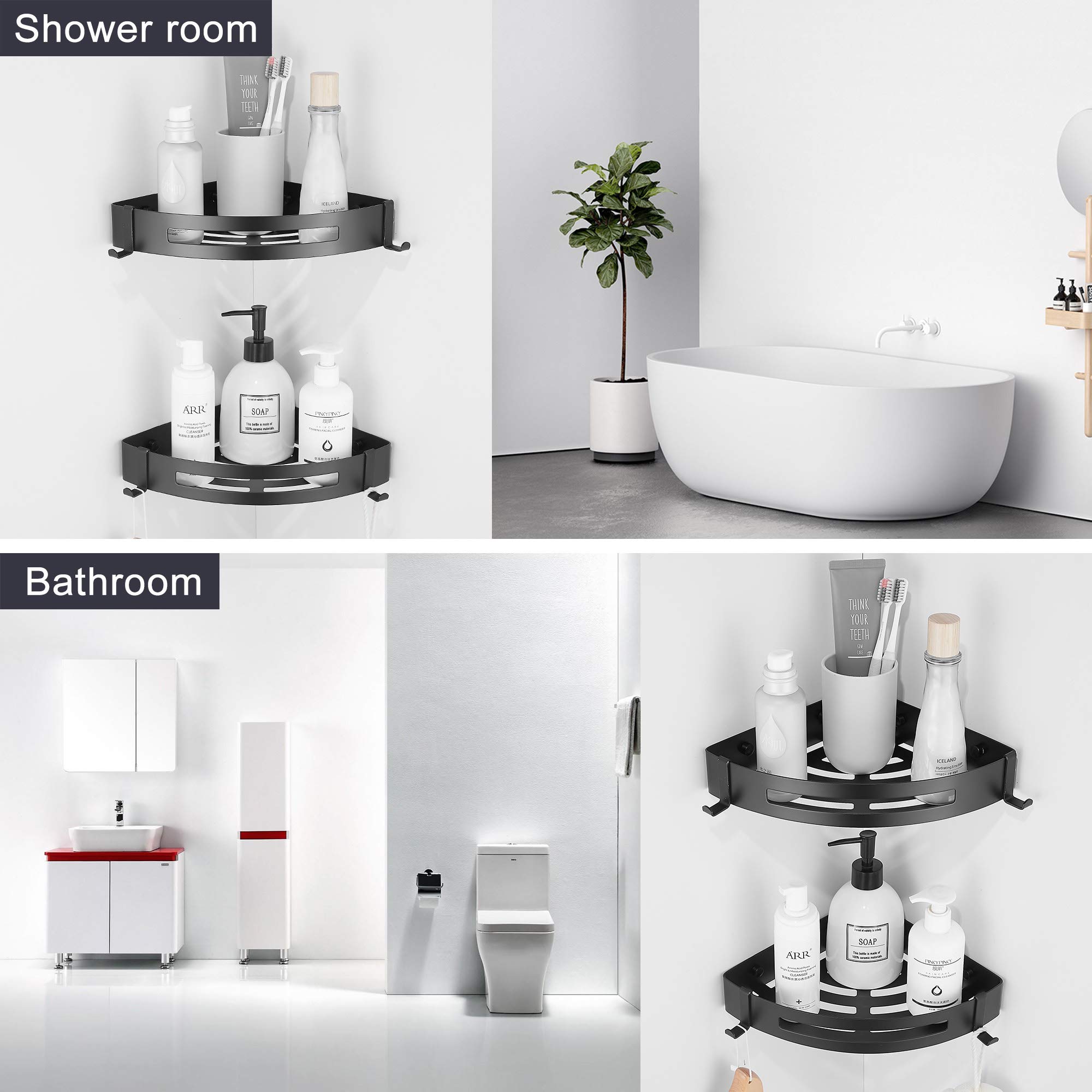 Угловая полка для ванной комнаты, душ без проверки, алюминий, нержавеющий клей, полка для ванной комнаты, настенный органайзер для душа, прямоугольный треугольник, серый, с вешалкой для чистки и крючком, 2 шт., матовый черный