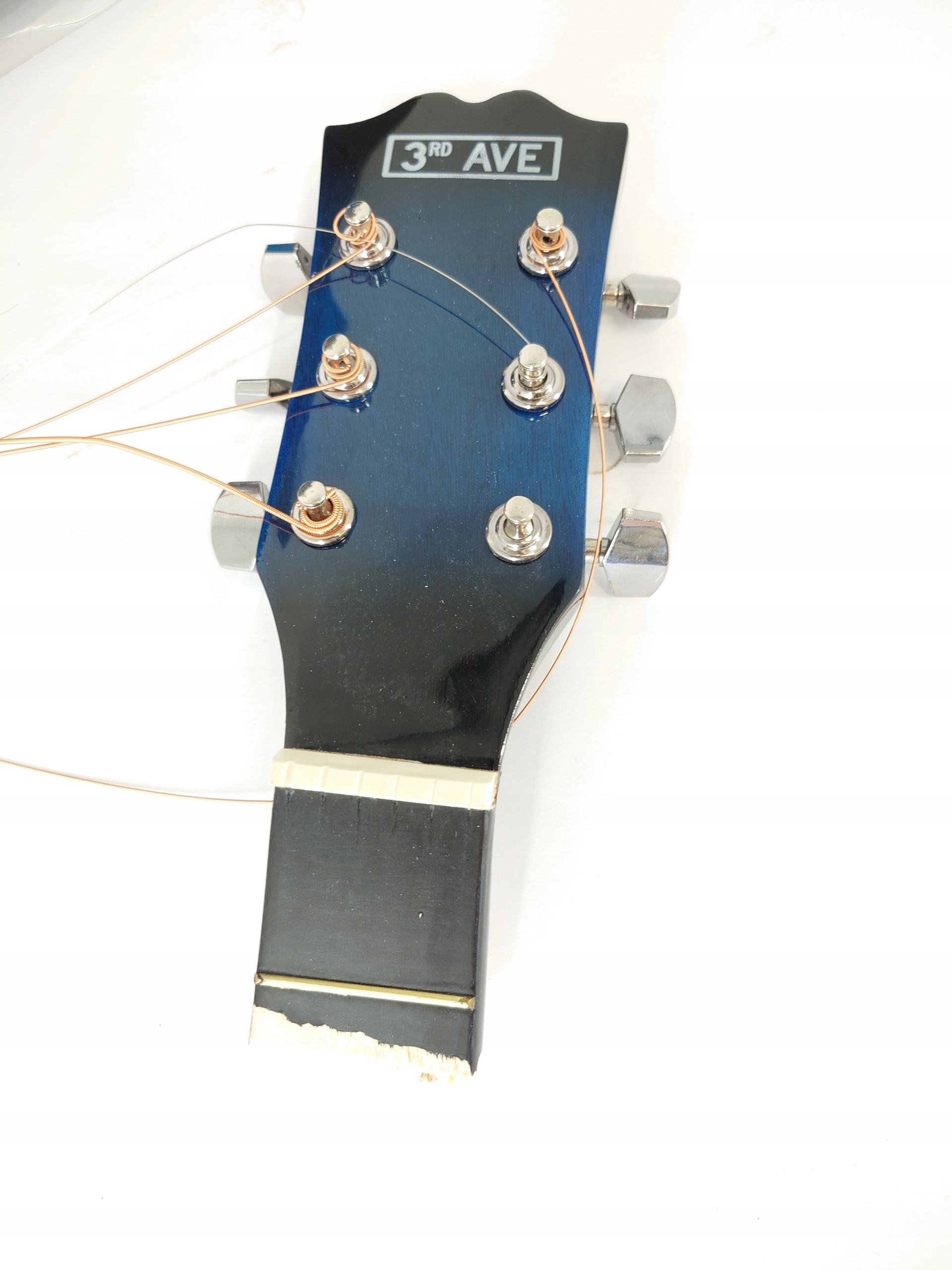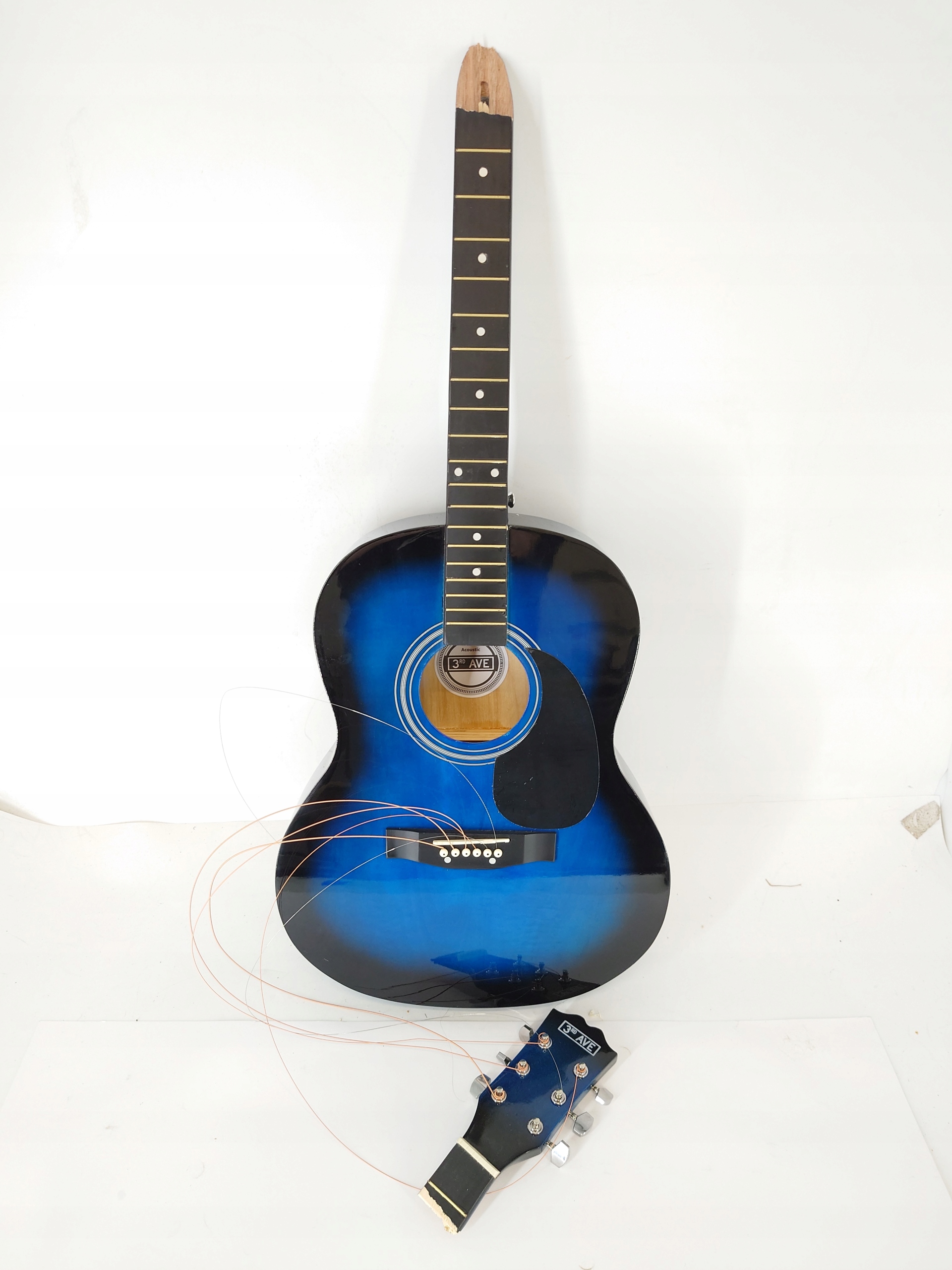 поврежденная гитара - сломанная шея. Нет гитарного ремня подвески на плече.