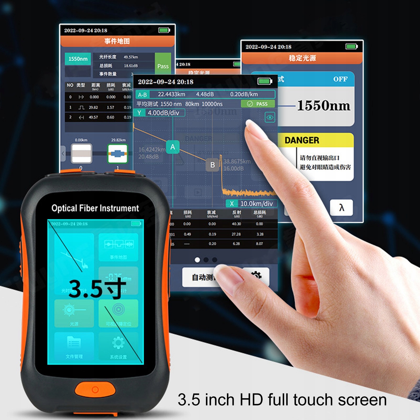 1. Полноценный HD-экран: 3,5-дюймовый полноценный HD-экран не только обеспечивает четкое изображение, но и поддерживает мультитач для удобного взаимодействия. Рабочая длина волны 1550 нм позволяет проводить тестирование освещения.