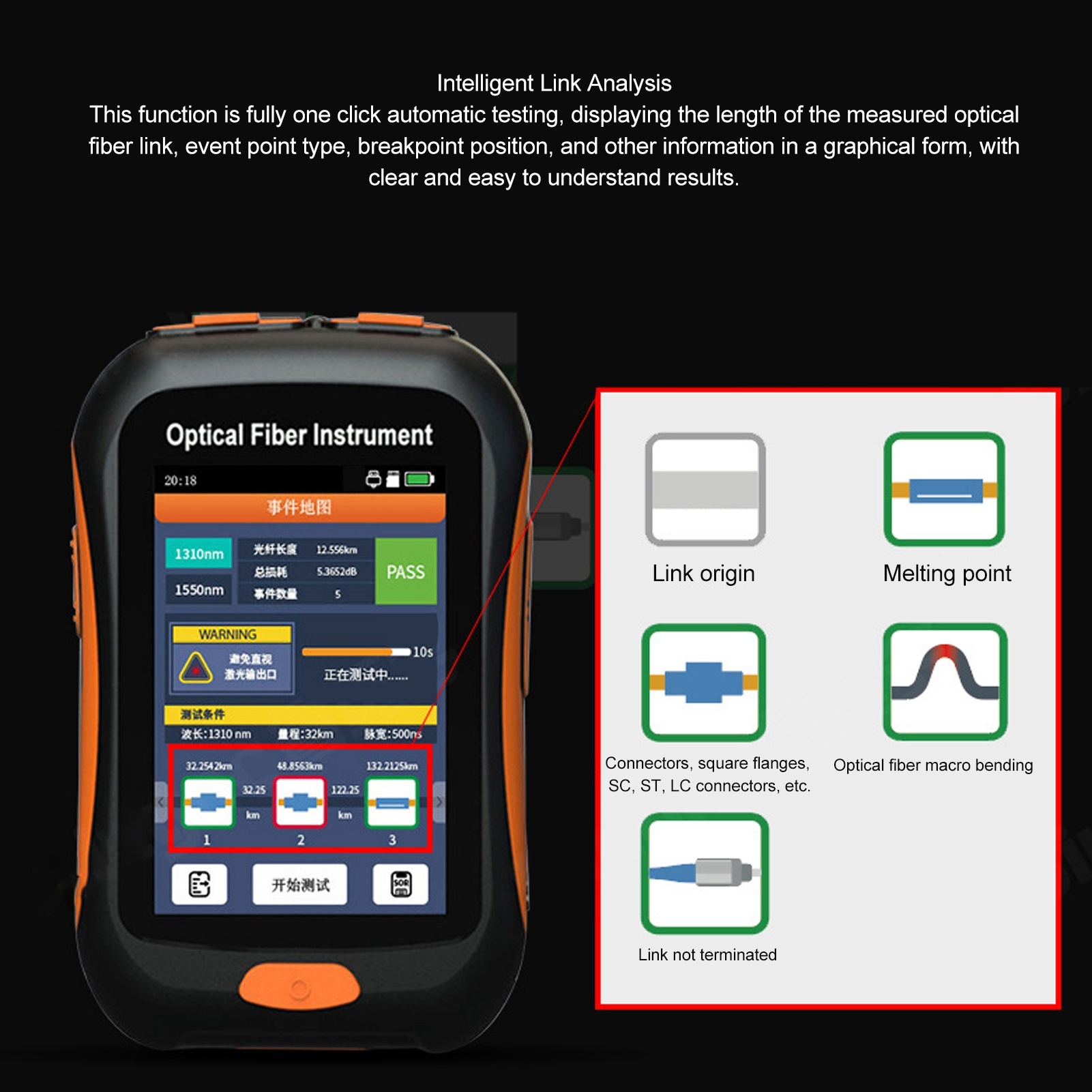 3. Интеллектуальный анализ каналов: оптический рефлектометр во временной области обеспечивает интеллектуальный анализ каналов и интуитивно представляет событие анализа, что упрощает понимание и принятие решений.