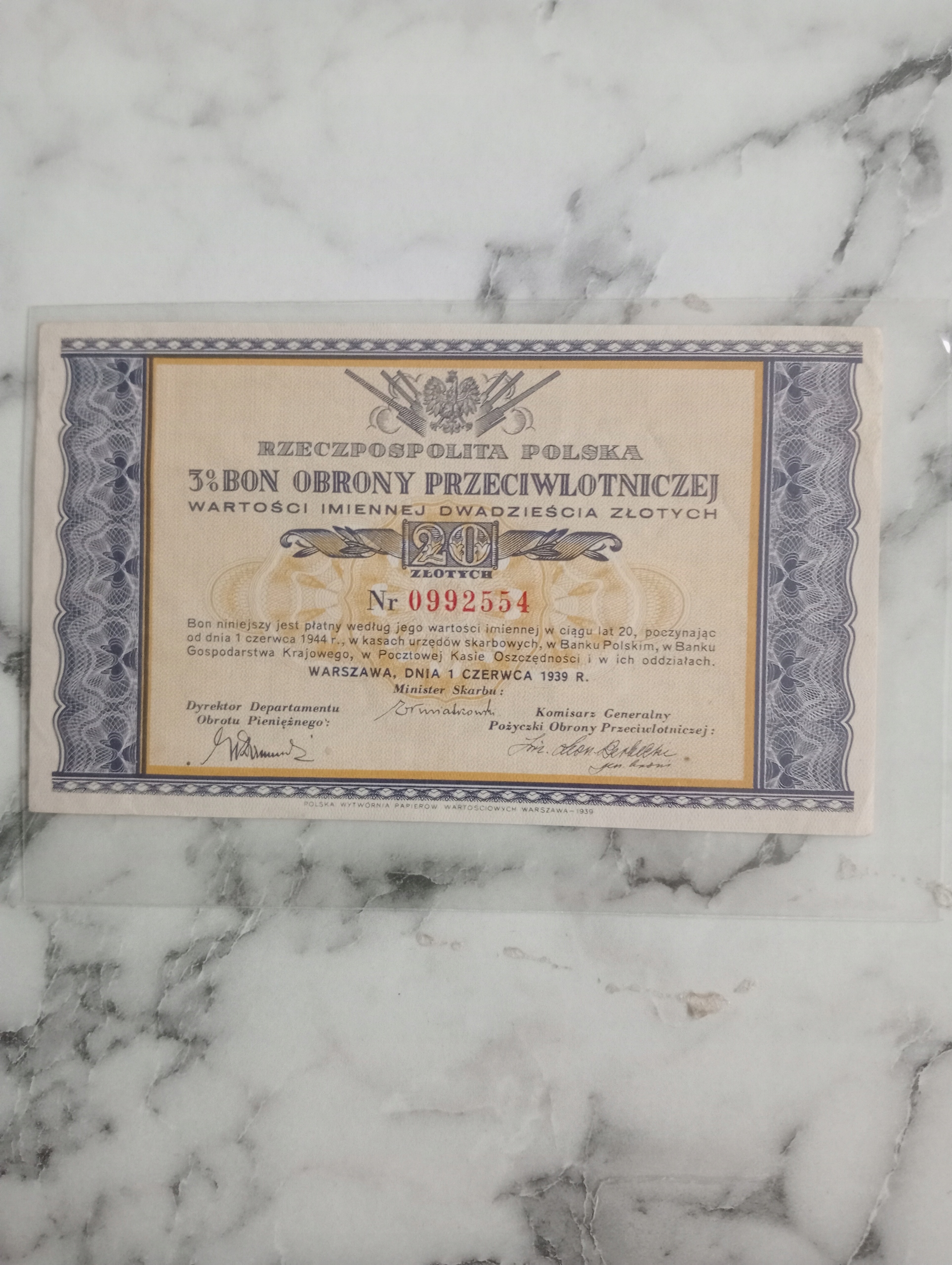 3% BON OBRONY PRZECIWLOTNICZEJ WARTOŚCI IMIENNEJ DWADZIEŚCIA ZŁOTYCH 1939