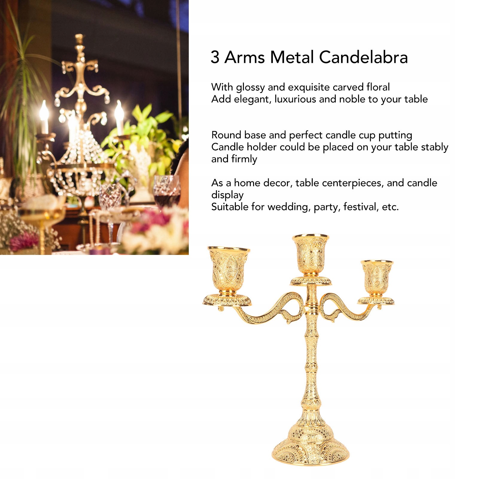Функция: 1. Удовлетворяющее украшение: 3-строчная подставка свеча, украшенная блестящими и изысканными резными цветами, которые добавят элегантность и роскошь к вашему столу.