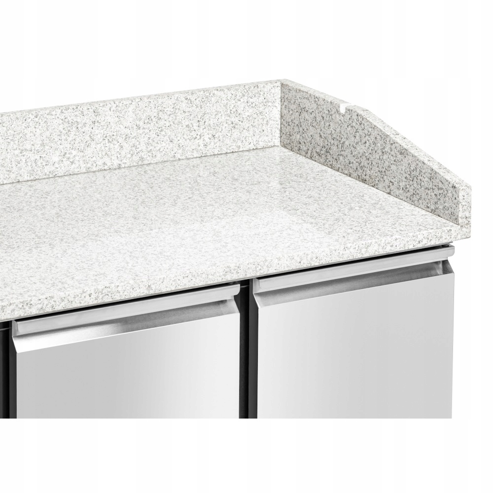 Охлаждаемый стол для пиццы с 3 дверцами от Forgast. Нижний блок. И корпус, и внутренняя часть изготовлены из нержавеющей стали. Большая гранитная столешница размером 134х67 см с бортами высотой 15 см. дверной уплотнитель.