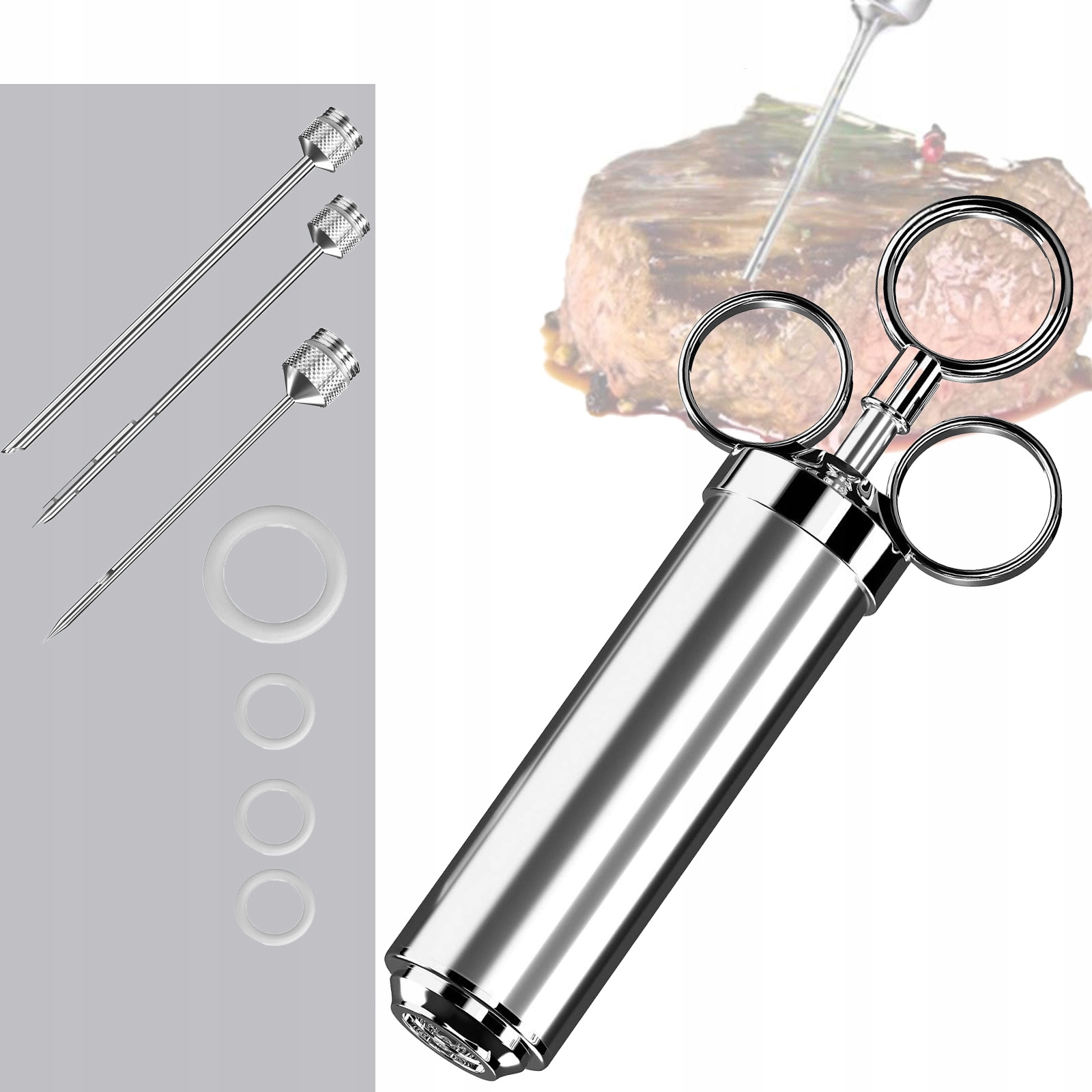 - Первая игла с широкой розеткой идеально подходит для нанесения маринадов с большими кусочками специй Игла с множеством отверстий на разных высотах гарантирует даже мясо прямотух,