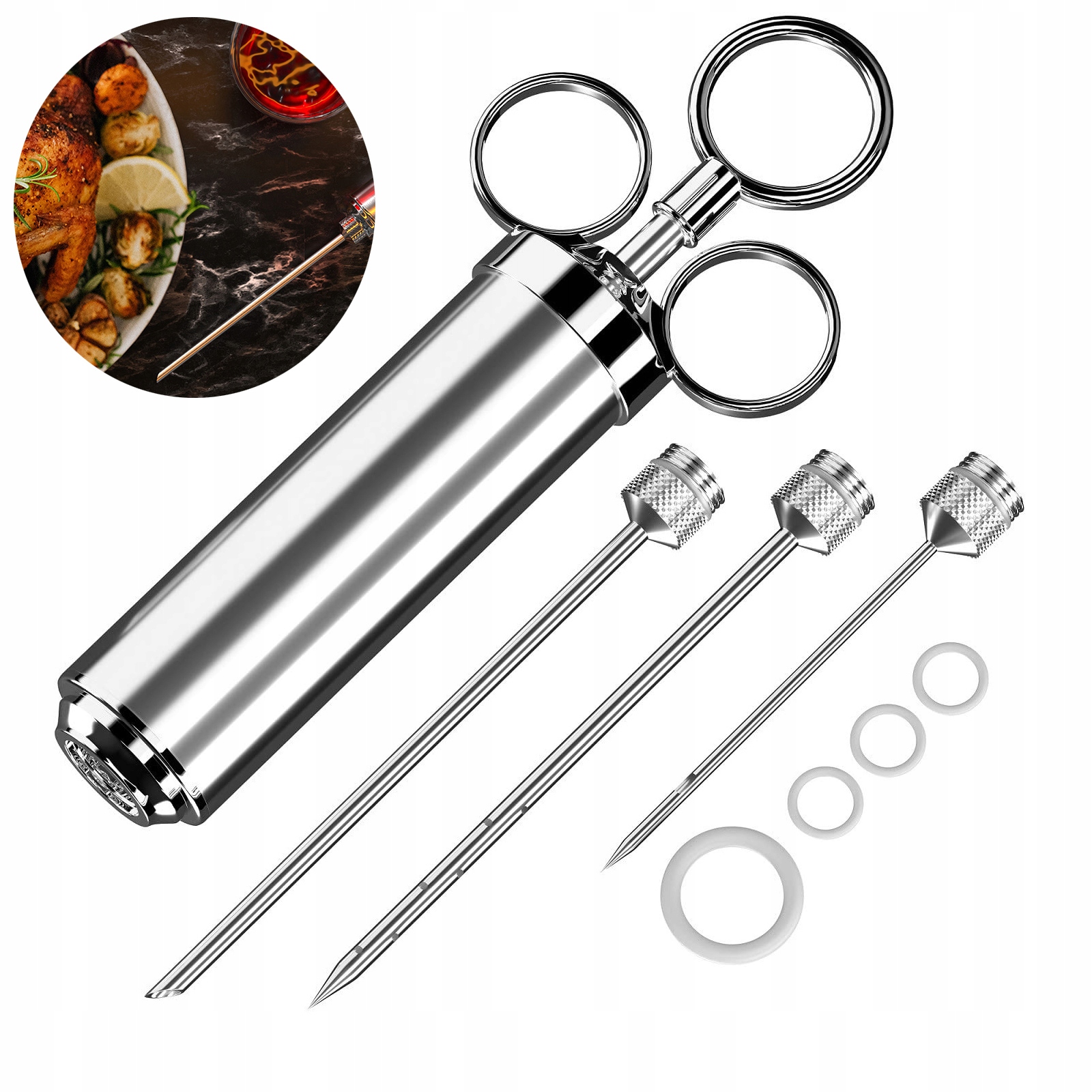 - Первая игла с широкой розеткой идеально подходит для нанесения маринадов с большими кусочками специй Игла с множеством отверстий на разных высотах гарантирует даже мясо прямотух,