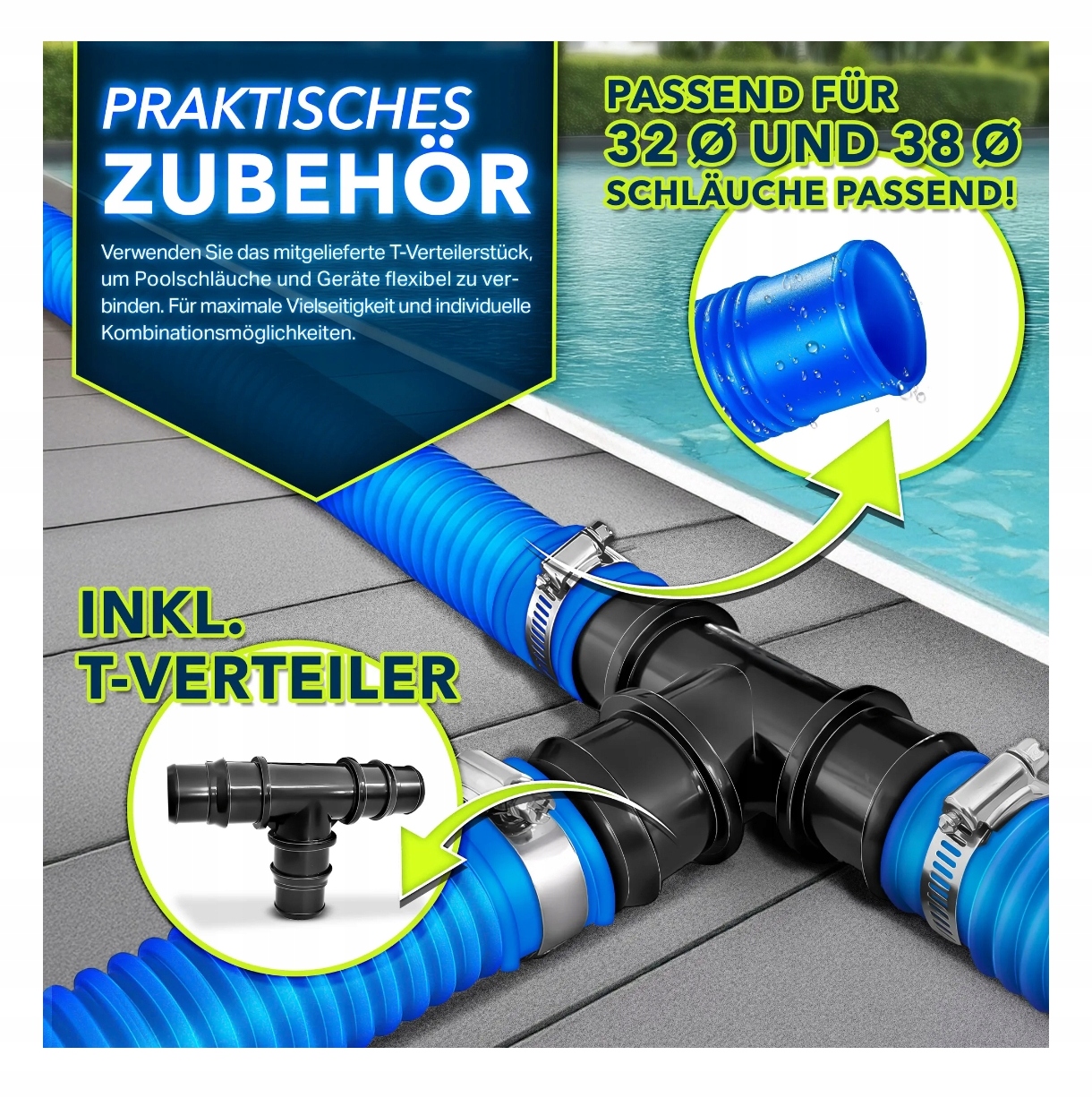- Обводной комплект для бассейна подходит для шлангов диаметром 32/38 мм.