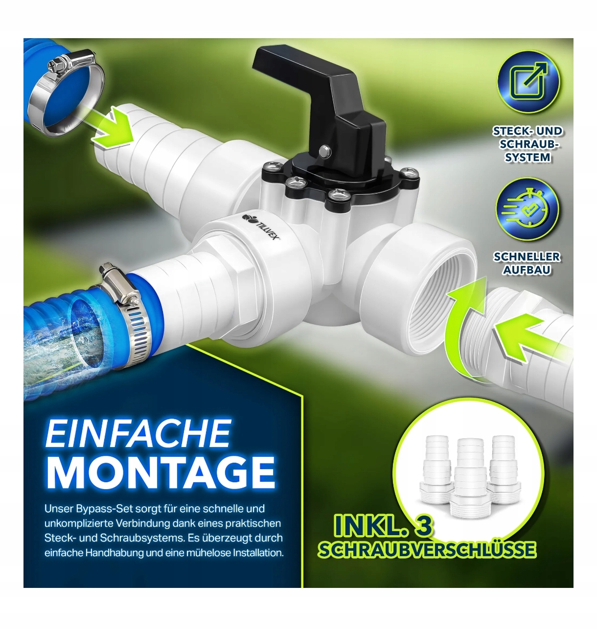 УНИВЕРСАЛЬНОЕ ПРИМЕНЕНИЕ: Байпасный комплектtilvex с трехходовым клапаном является идеальным решением для гибкого управления циркуляцией воды в бассейне. Идеально подходит для использования с солнечным обогревателем, тепловым насосом, системой песочных фильтров или солнечным коллектором. Поток воды контролируется байпасом и может распределяться по мере необходимости. Подходит для всех стандартных шлангов для бассейнов диаметром 32 или 38 мм — идеально подходит для надземных бассейнов, стоечных бассейнов и стационарных бассейновых систем.